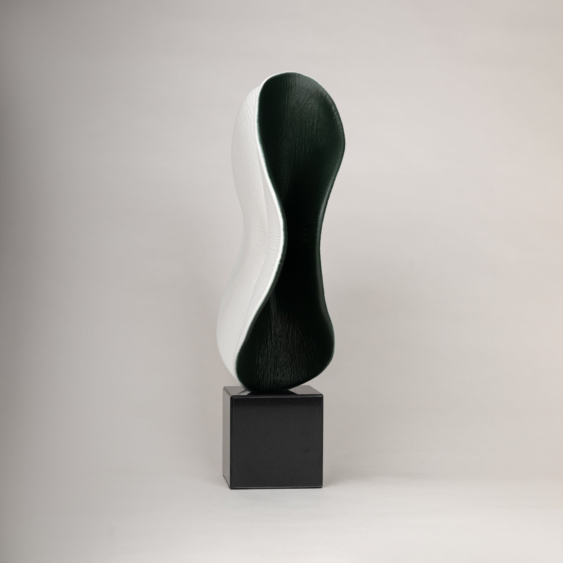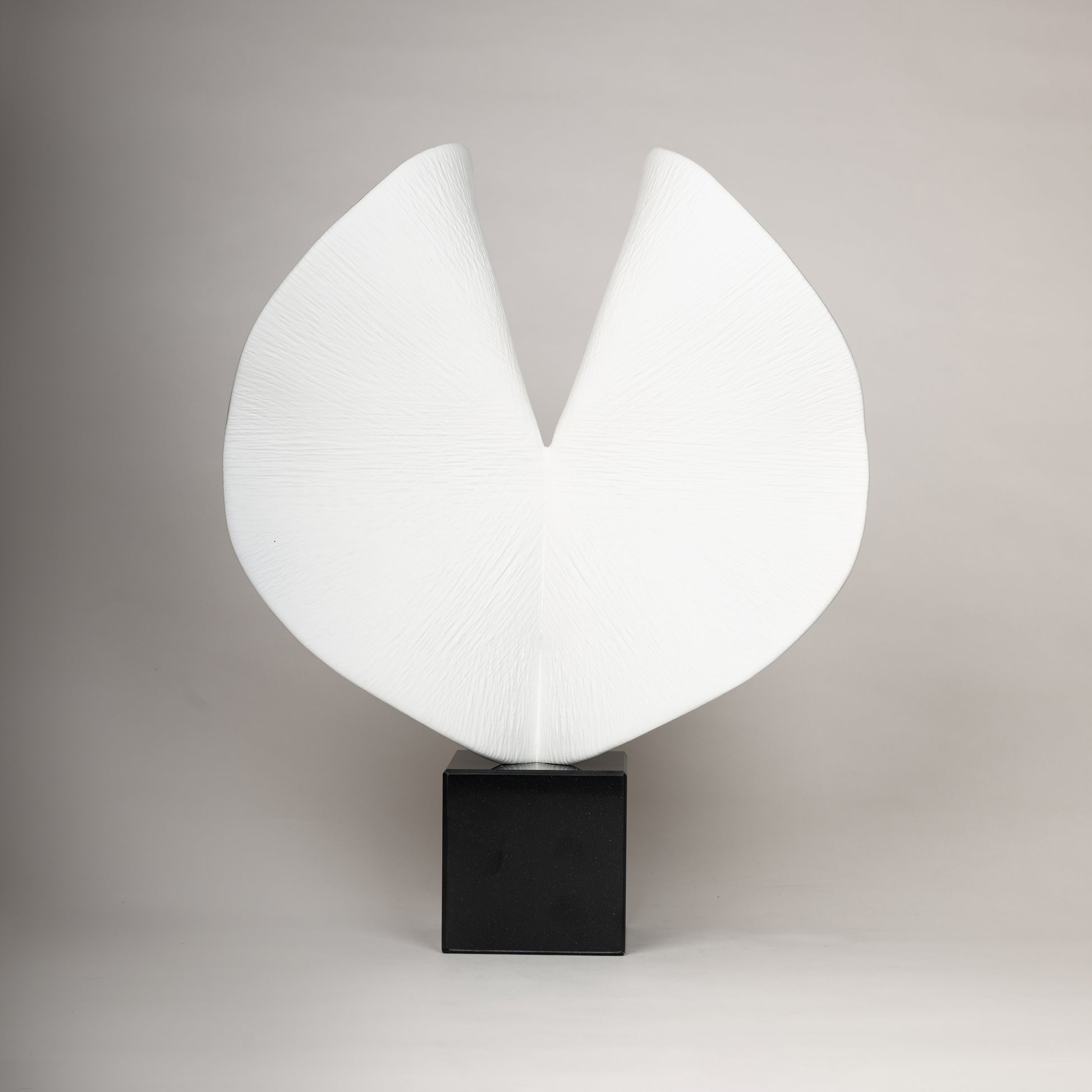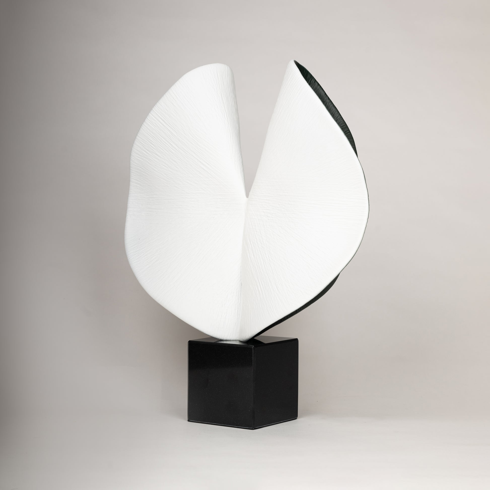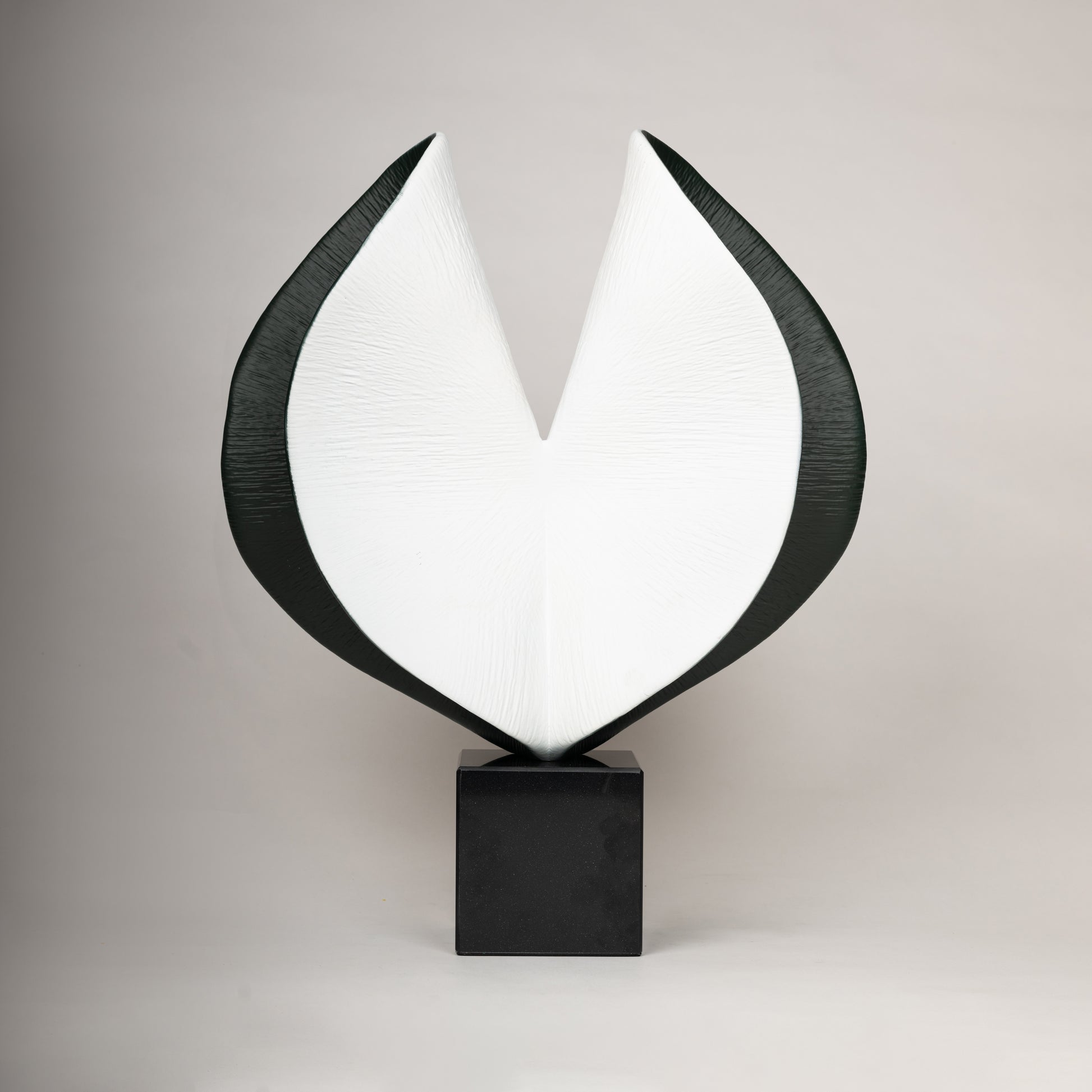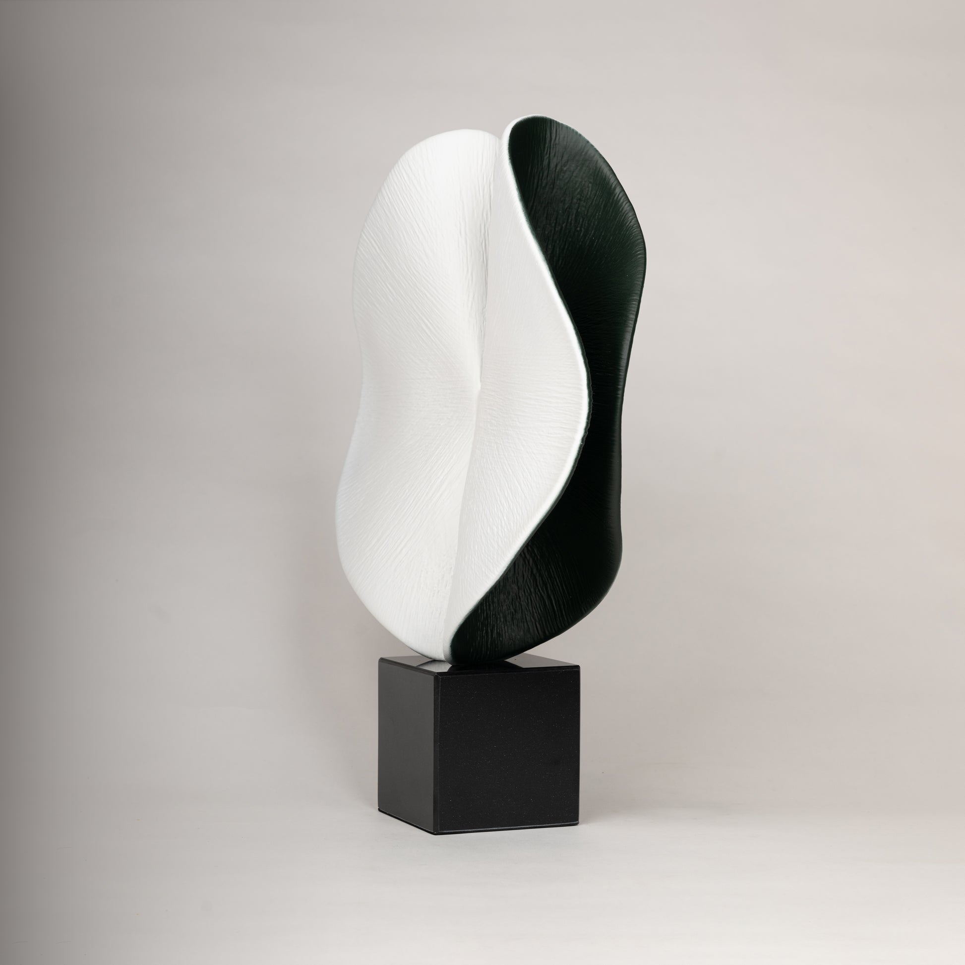 The Abstract Blooming Petal Sculpture is a captivating fusion of organic beauty and modern design. Inspired by the delicate unfolding of petals, this sculptural piece features a striking contrast of black and white, emphasizing its elegant curves and textural details. Mounted on a solid black base, its symmetrical yet fluid form evokes a sense of movement and balance, making it a perfect statement piece for contemporary interiors, galleries, or luxurious office spaces.