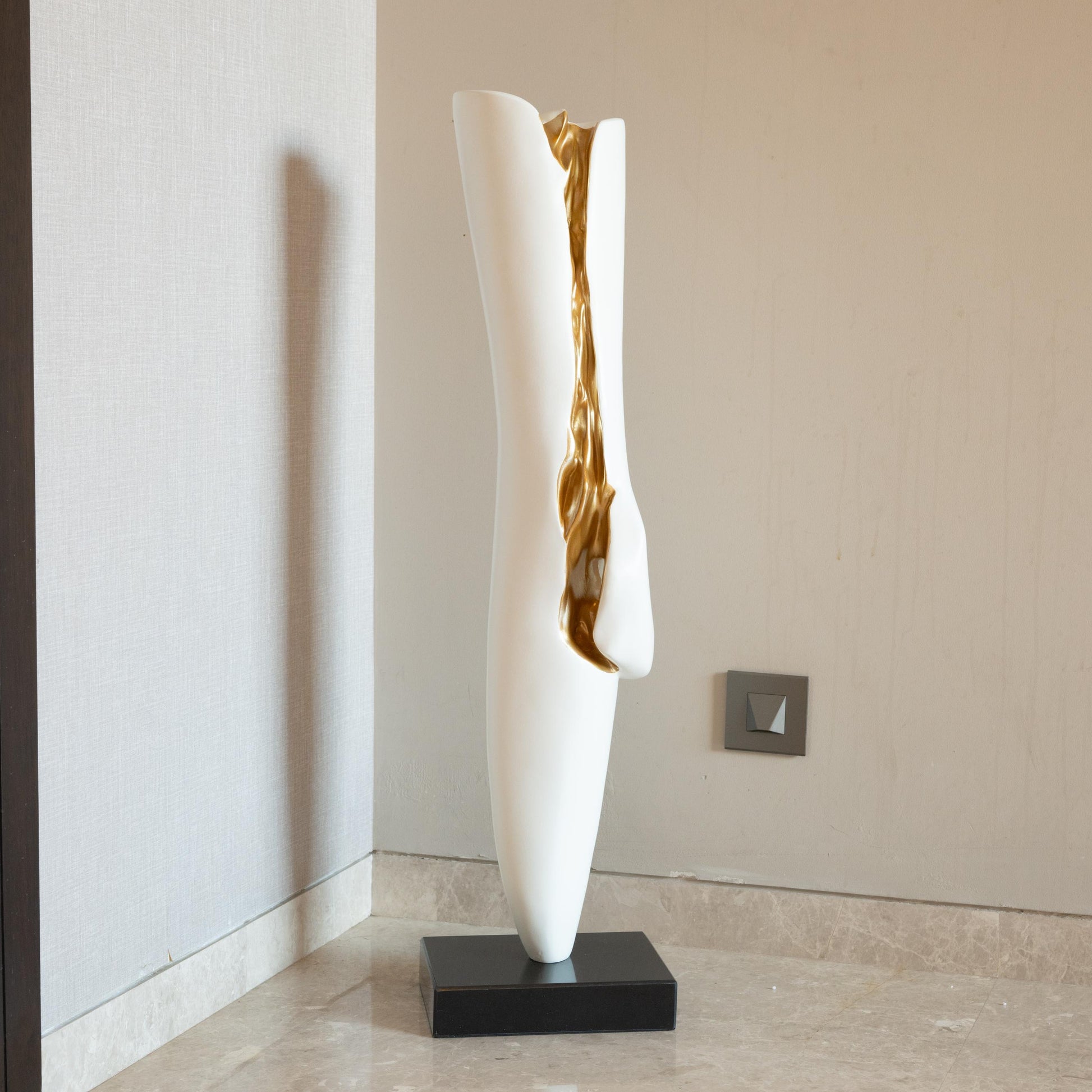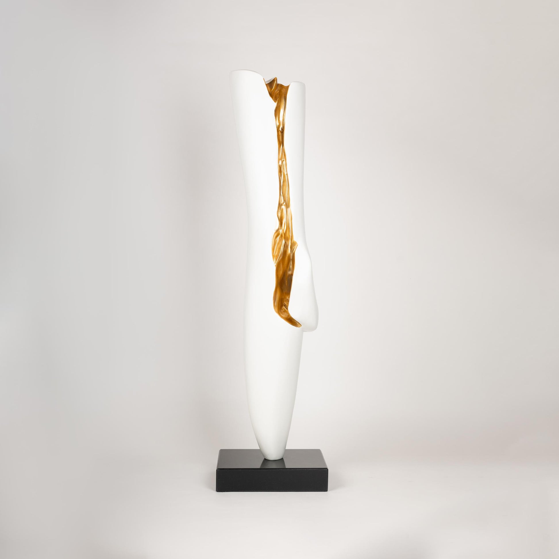 This modern abstract sculpture is a stunning fusion of minimalism and luxury. The smooth, white elongated form is gracefully interrupted by a flowing golden accent, symbolizing the beauty of imperfection and transformation. Mounted on a sleek black base, this artwork serves as a statement piece for contemporary interiors, adding a sense of sophistication and artistic depth.