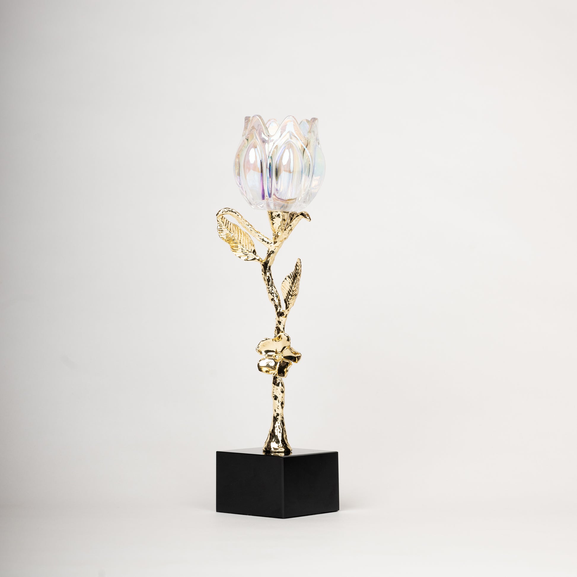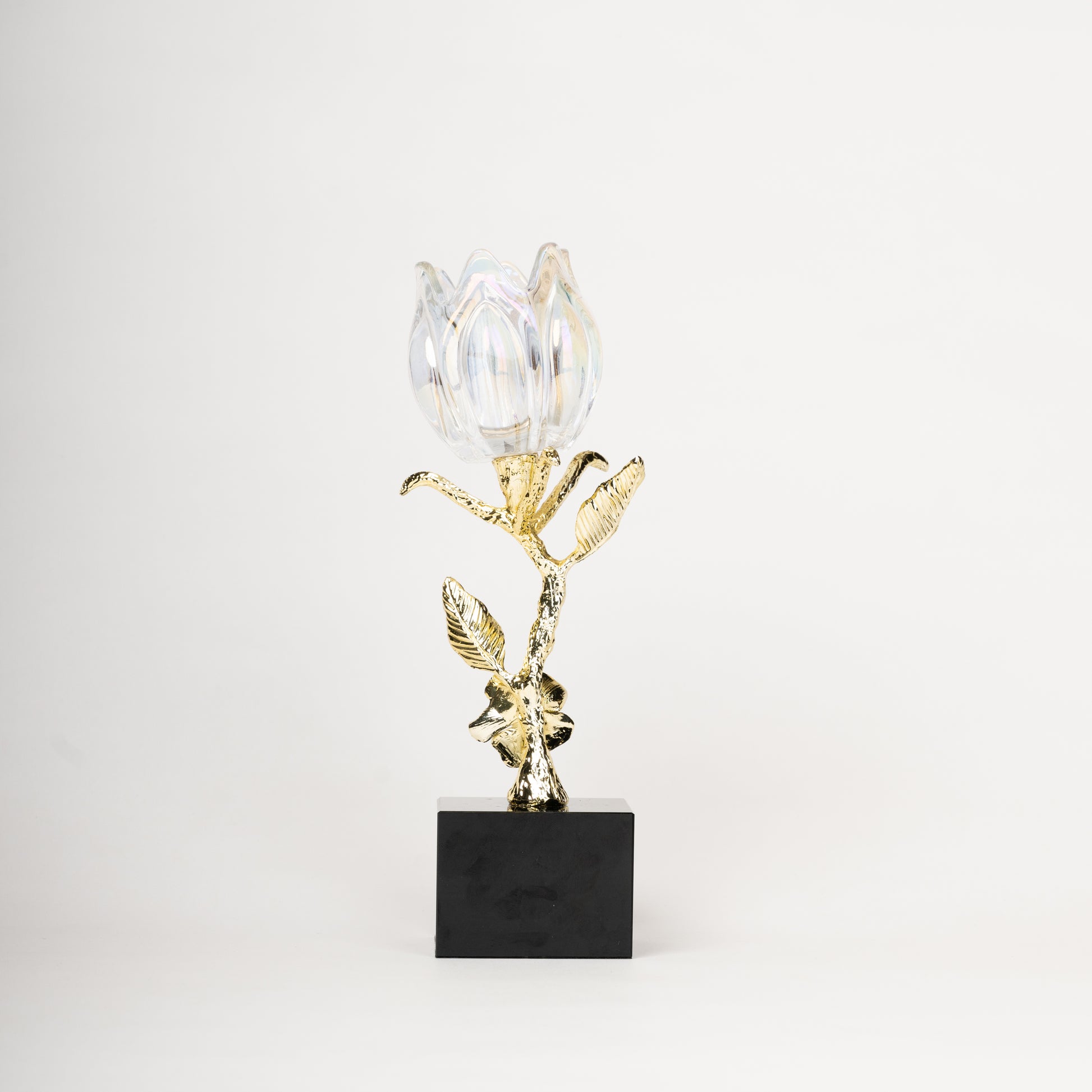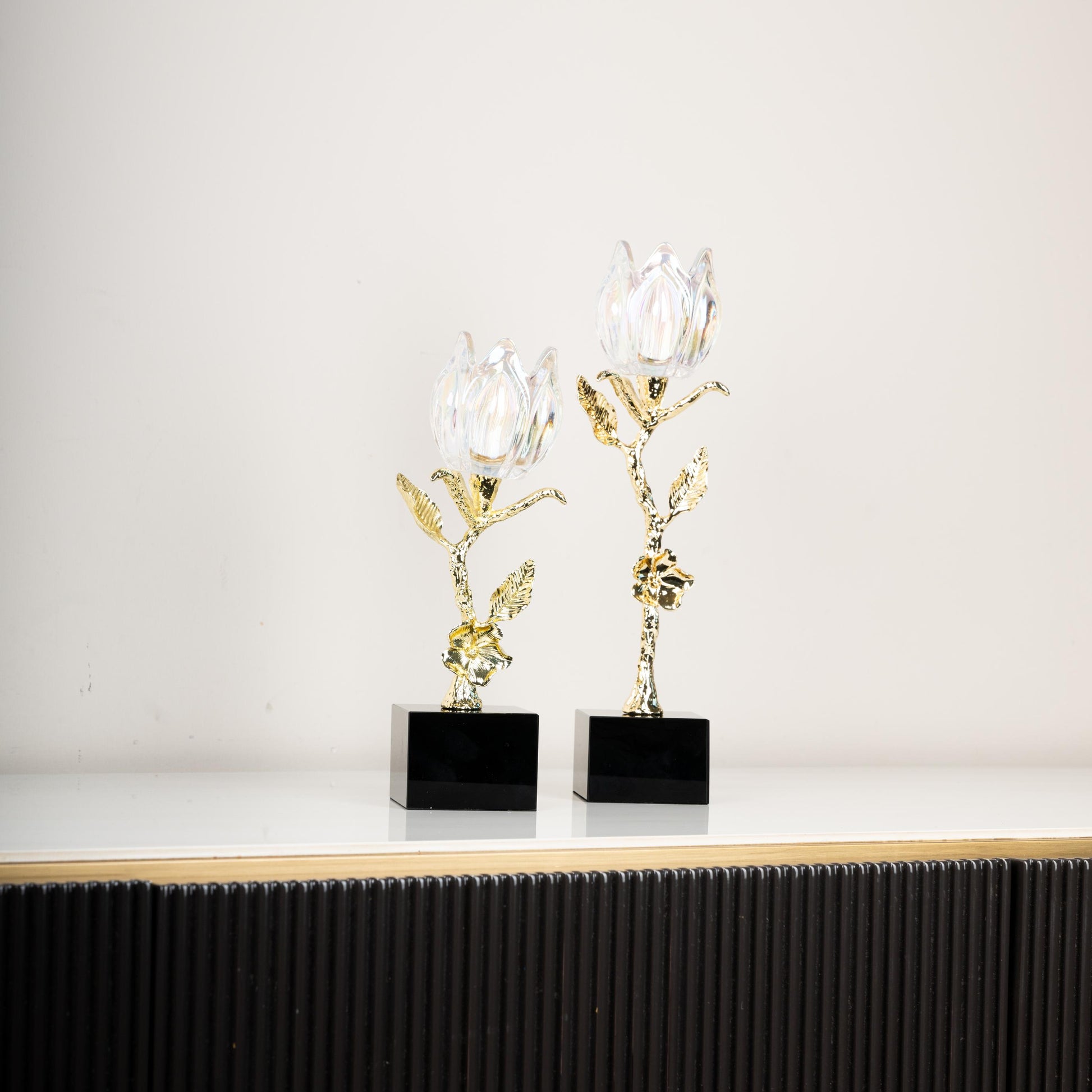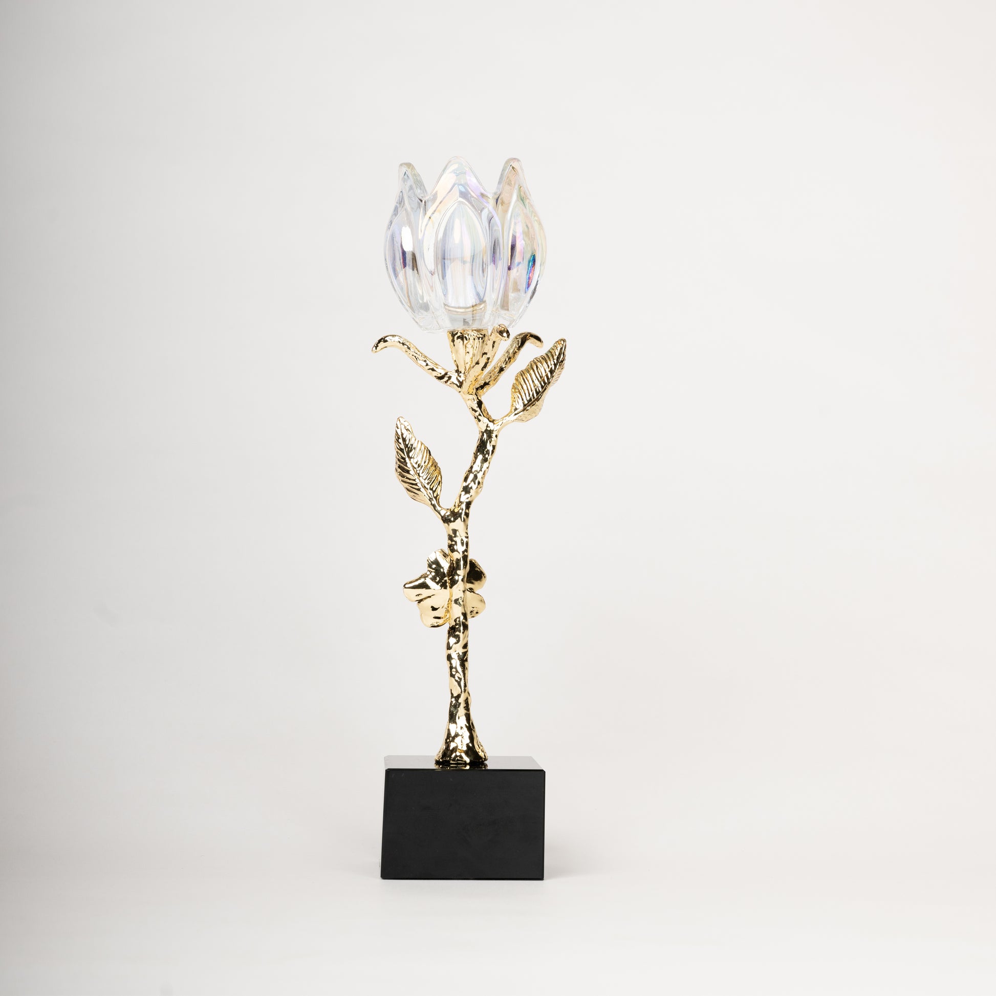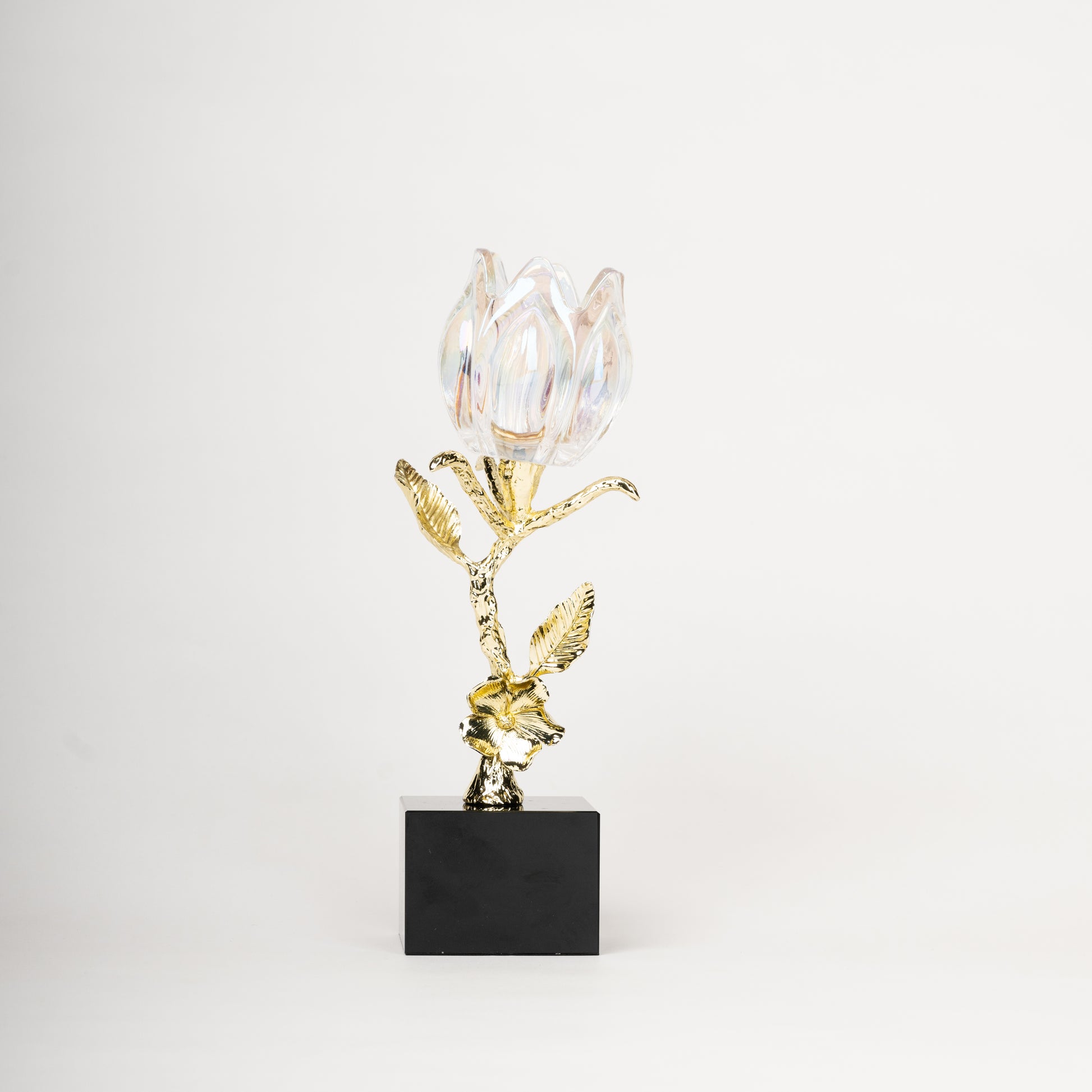 Add a touch of sophistication to your space with the Crystal Bloom Elegance, a stunning decorative piece that embodies luxury and artistry. This exquisite ornament features a delicately crafted gold-plated stem and leaves, adorned with a radiant crystal flower that captures and reflects light beautifully. Perfect as a centerpiece, gift, or collector's item, this timeless design enhances any home, office, or display with its refined elegance. Mounted on a sleek black base for stability and contrast, it blends modern luxury with classic craftsmanship. Elevate your interior with this breathtaking symbol of beauty and grace.