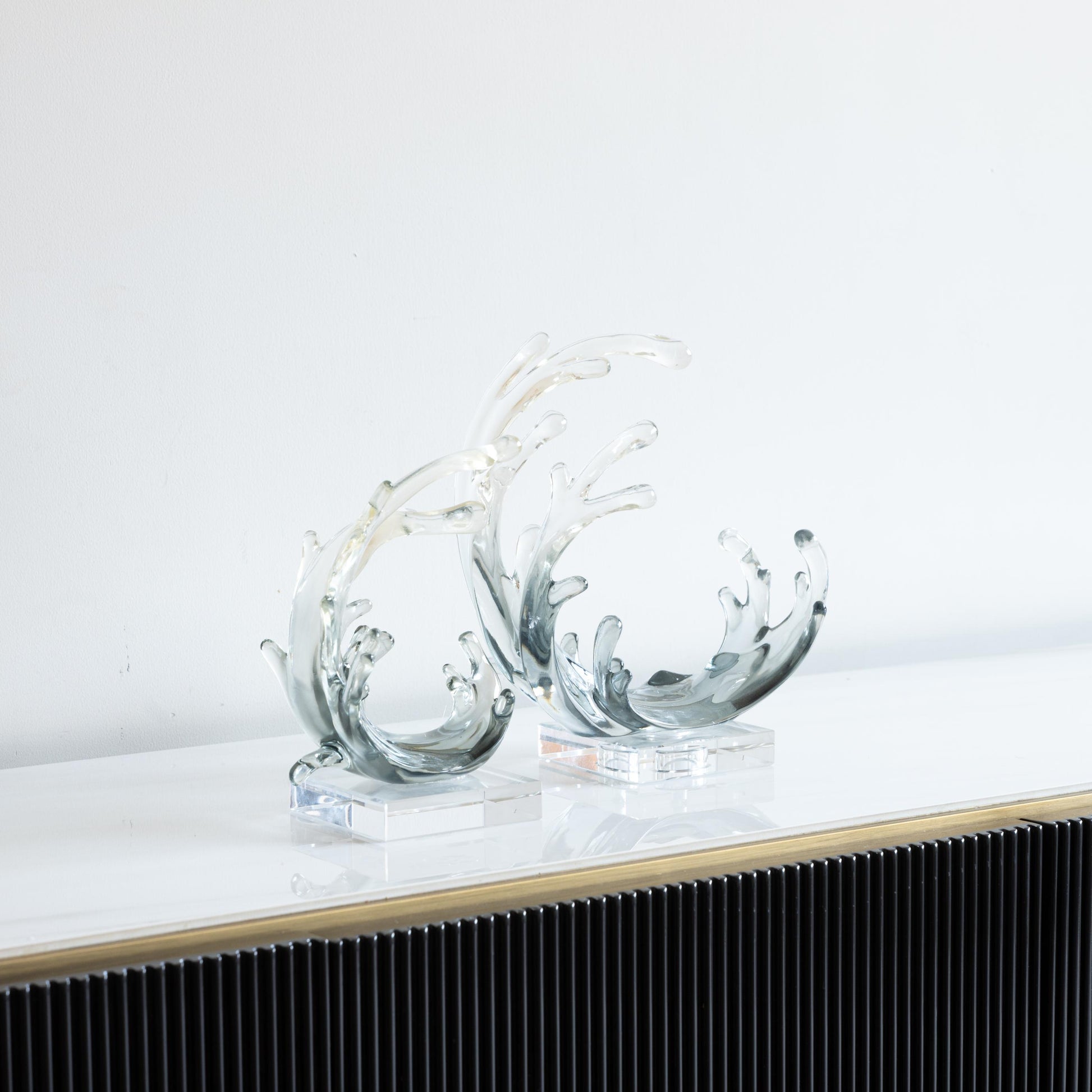 Inspired by the power and elegance of the ocean, the Crystal Ocean Wave Sculptures capture the dynamic beauty of rolling waves in motion. Crafted from high-quality glass or acrylic, these stunning pieces feature intricate details and a gradient of translucent hues that mimic the fluidity of water. Set on clear bases, they create a floating effect, making them perfect for modern interiors, coastal-themed décor, or as a statement centrepiece. These sculptures bring a sense of serenity and movement to any space, reflecting the harmony of nature's design.