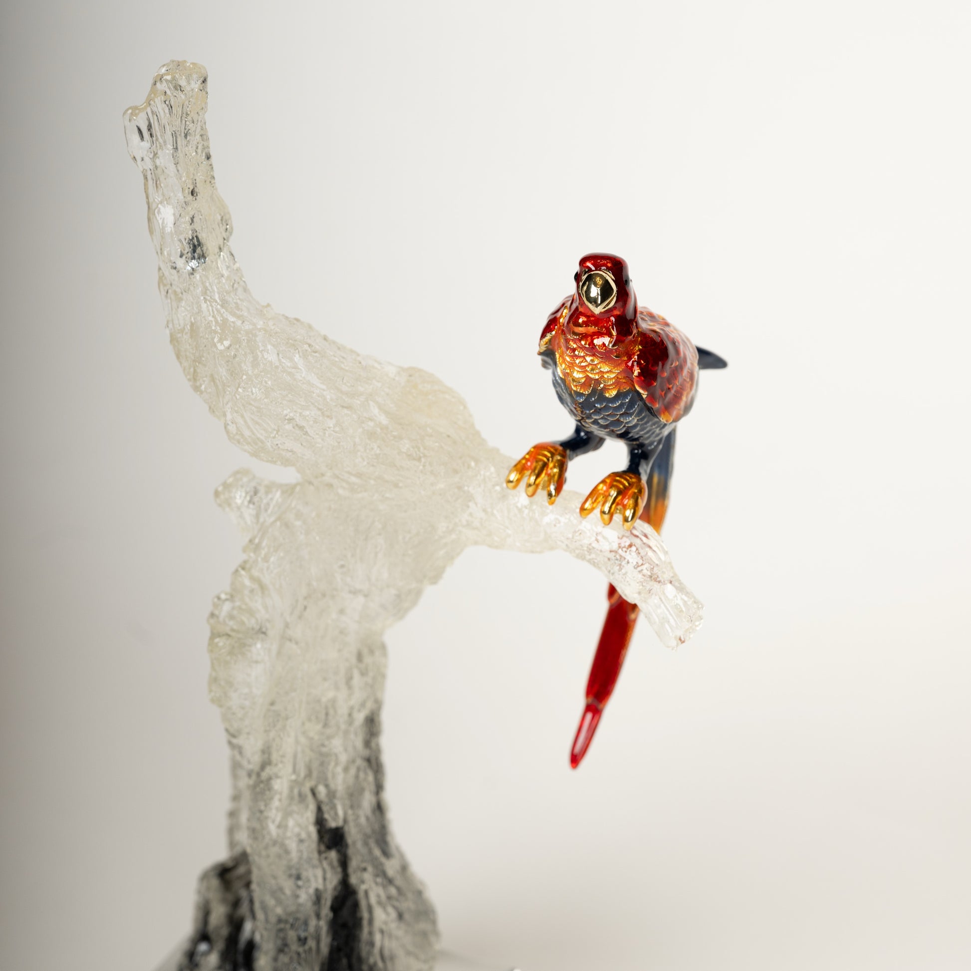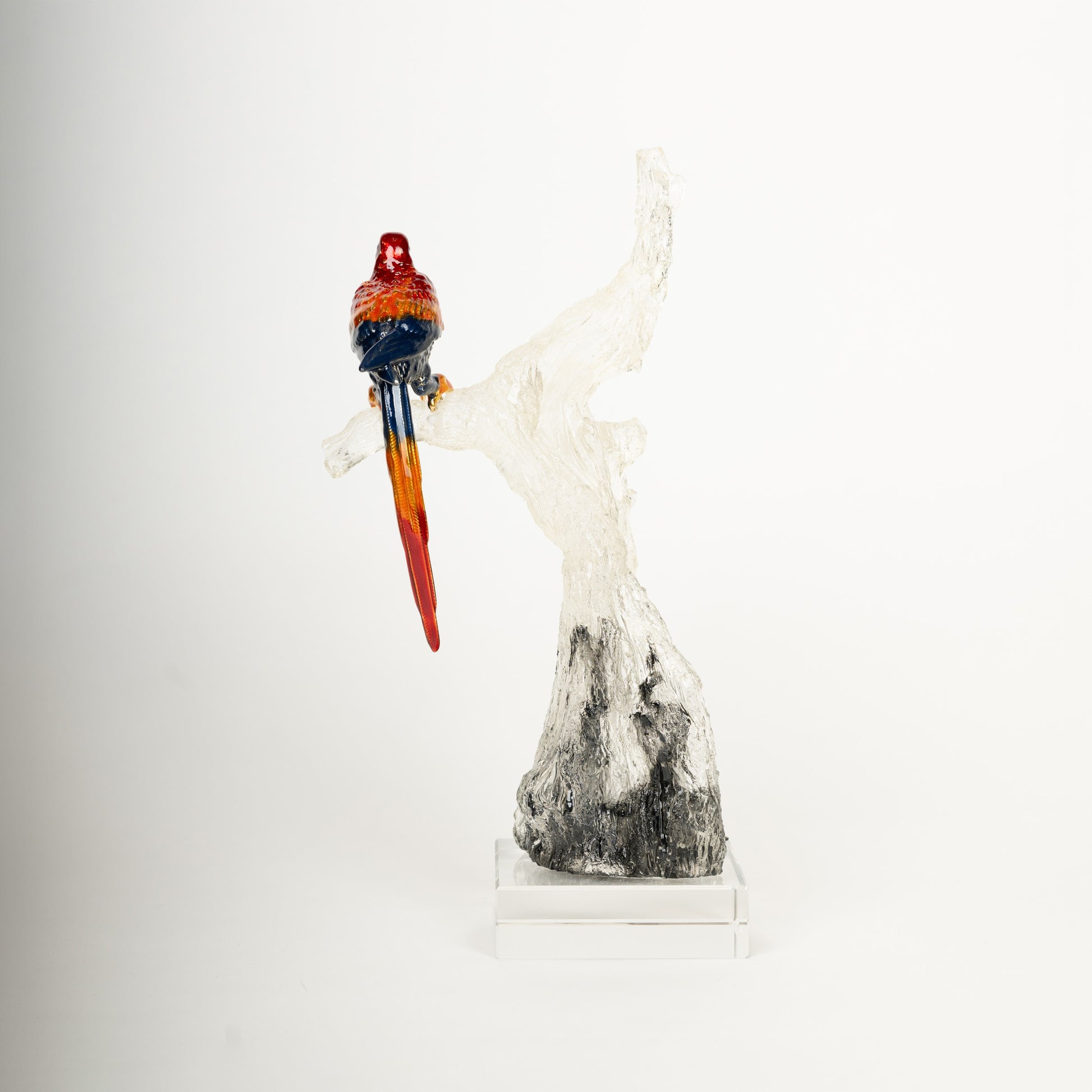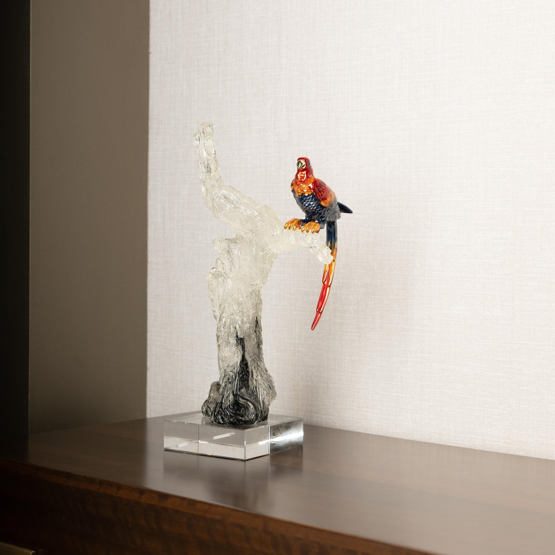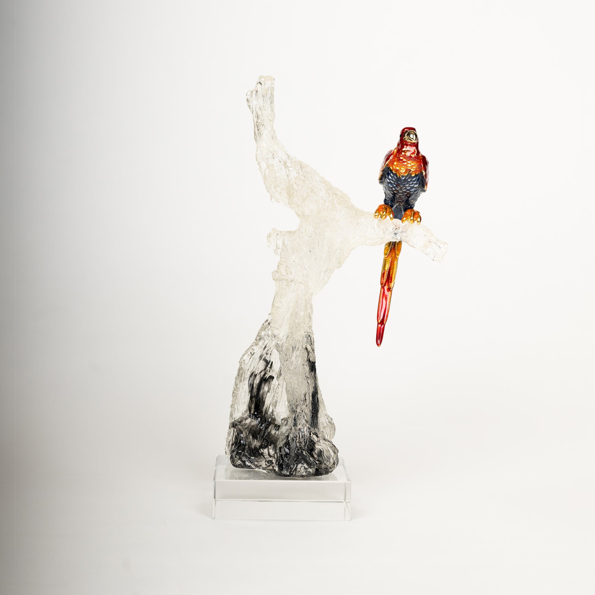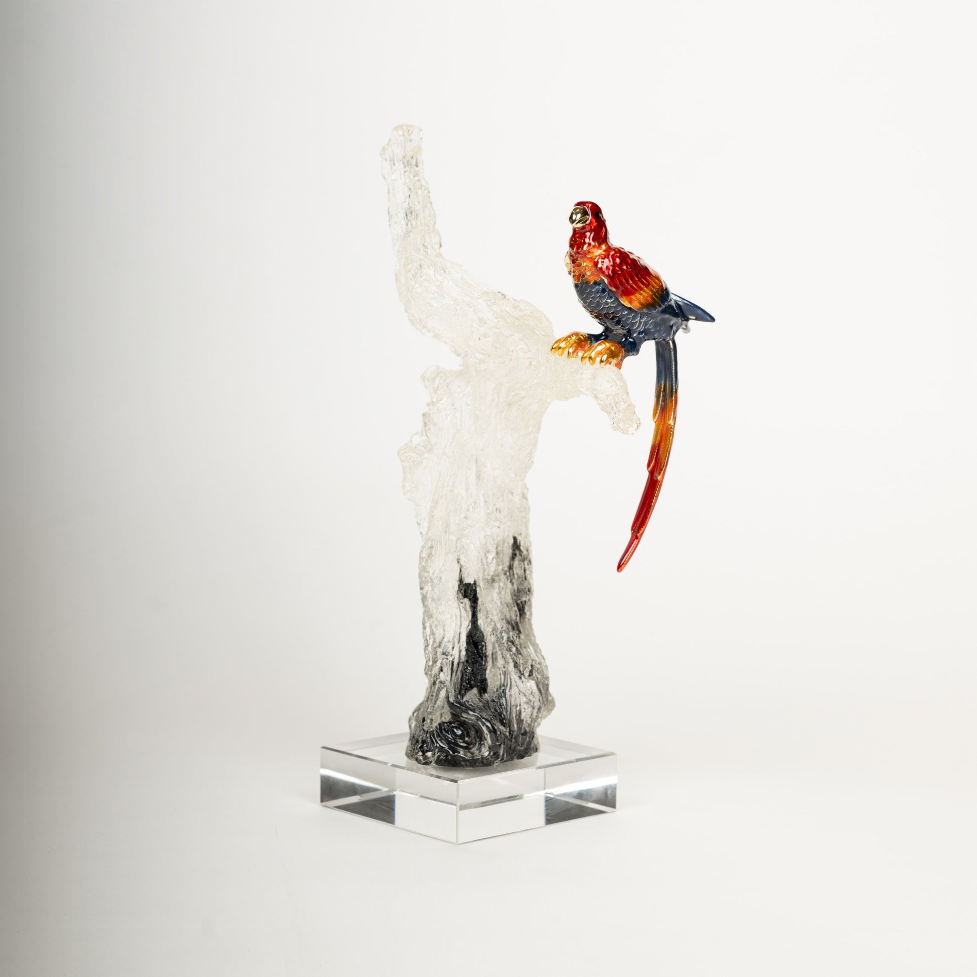 A mesmerizing handcrafted sculpture featuring a vividly colored parrot perched on a textured crystal-clear tree trunk. The lifelike details of the parrot, with its red, blue, and yellow feathers, add a bold contrast to the transparent, sculptural tree. Mounted on a sleek square base, this artistic piece combines elegance and nature-inspired charm, making it an exquisite decorative accent for any luxurious interior.