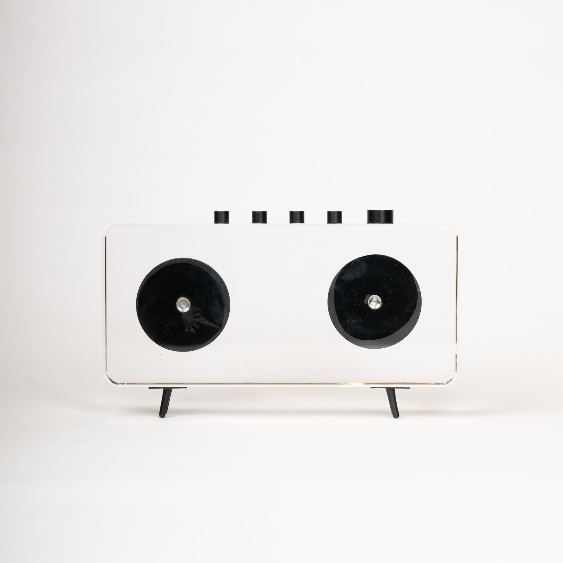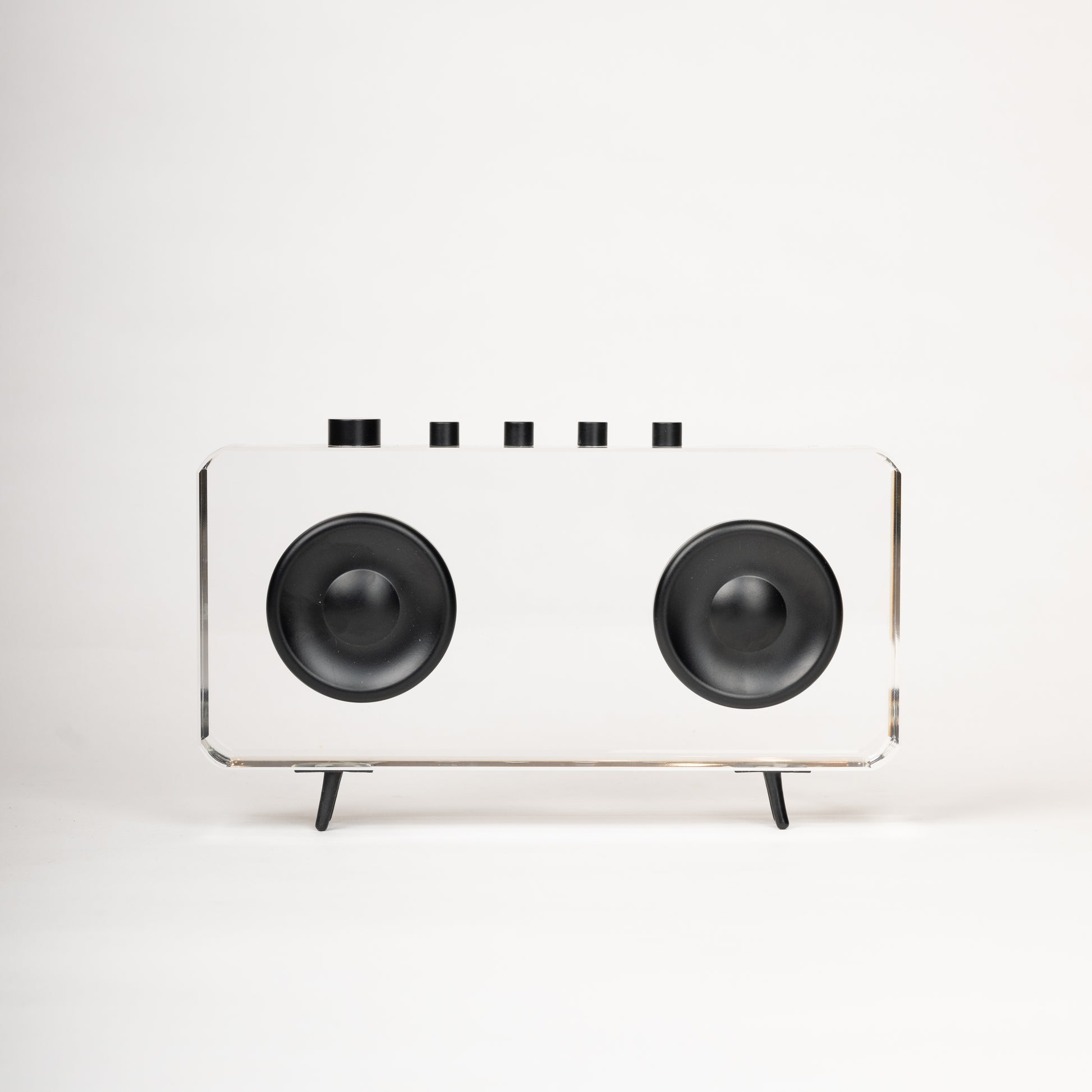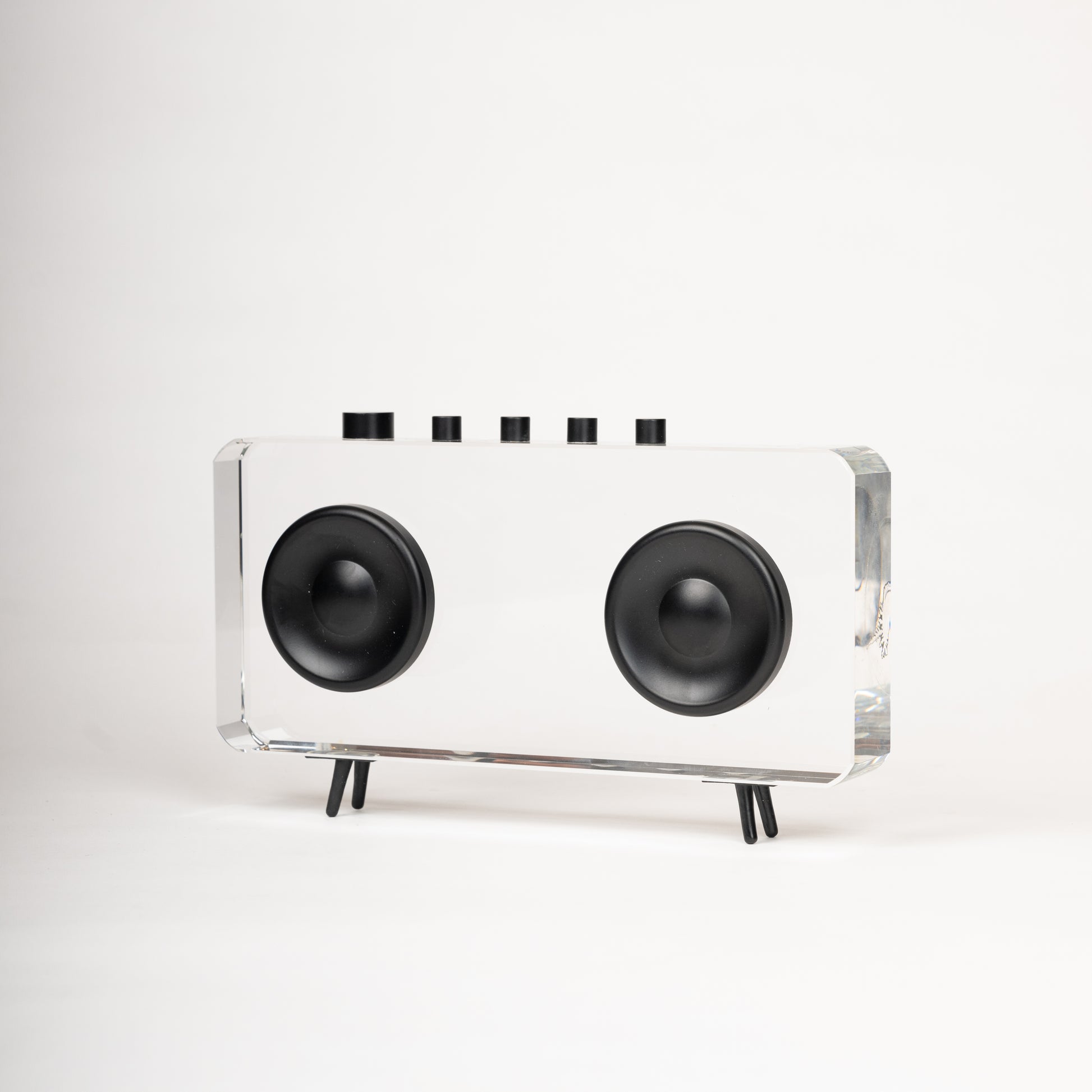 Add a touch of modern elegance to your space with this Crystal Radio Decor. Designed to resemble a retro radio with a futuristic twist, this piece is crafted from high-quality clear crystal, making it a stylish yet subtle addition to any home or office. The dual black speaker-like accents create a striking contrast, giving it a sleek and sophisticated appeal. Perfect for console tables, shelves, or workspaces, this decor piece effortlessly blends minimalism with artistic charm. Elevate your interior styling with this unique decor piece—where vintage inspiration meets modern sophistication!