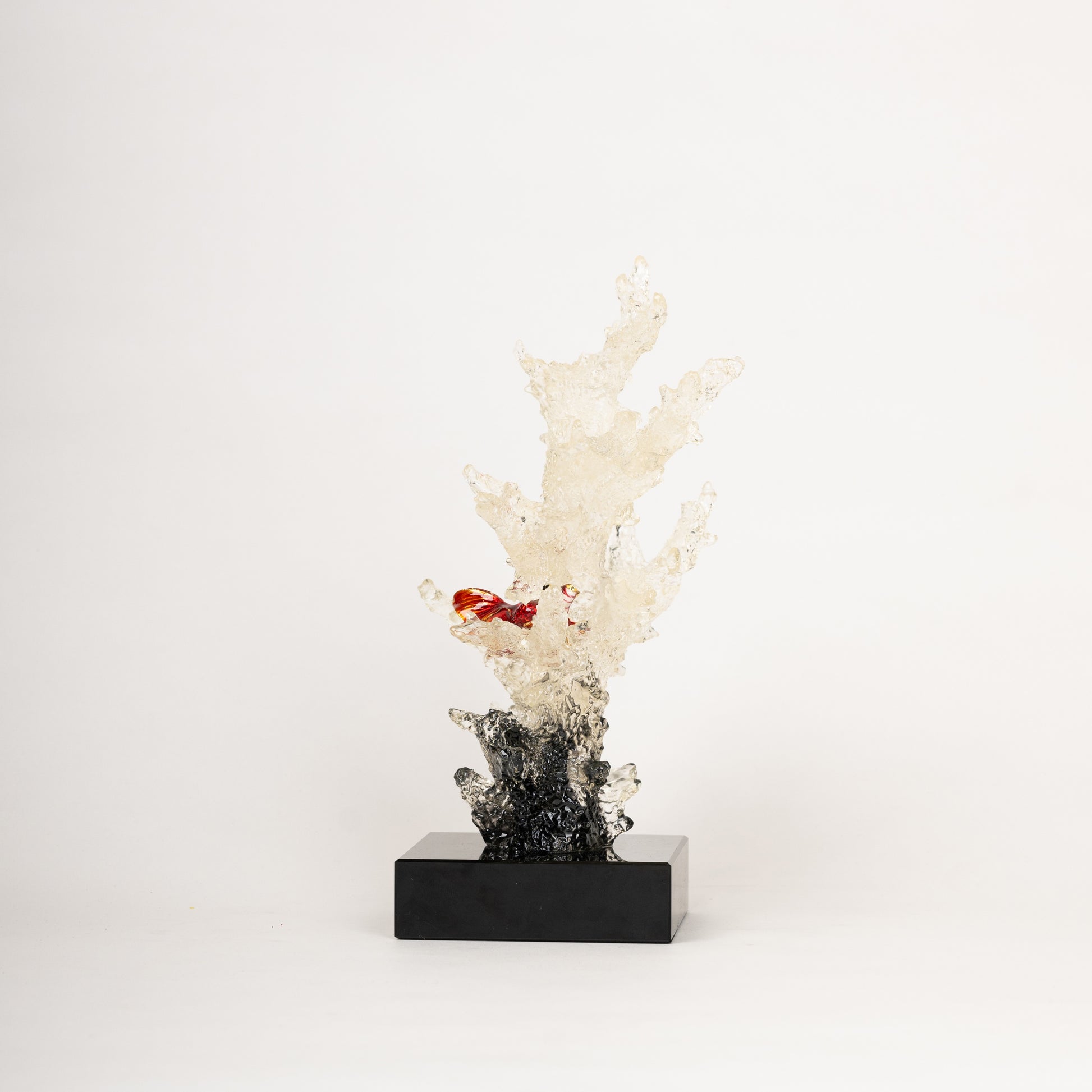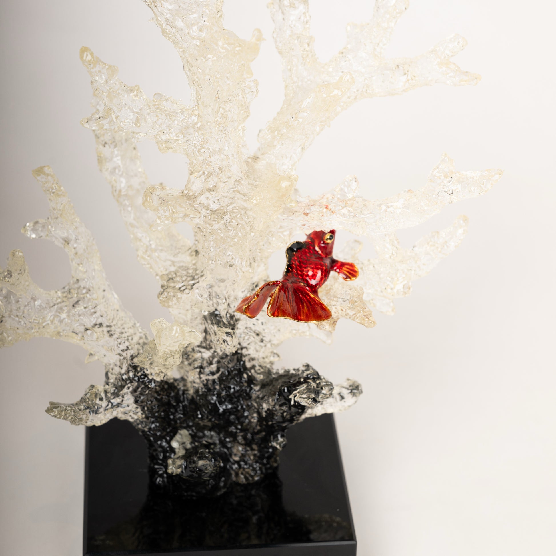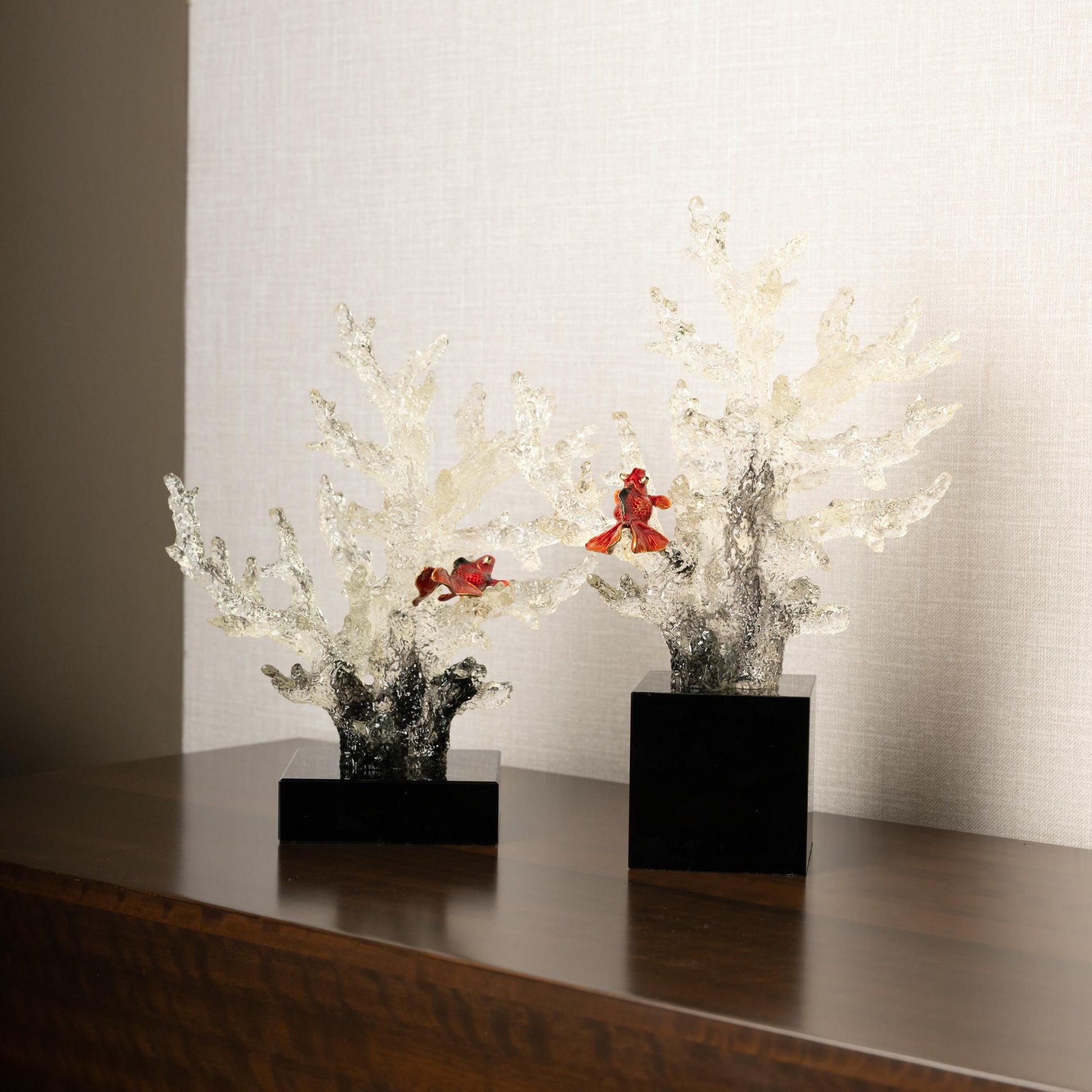 A captivating pair of handcrafted sculptures featuring intricate, crystal-clear coral branches mounted on sleek black bases. Delicately placed among the coral are vibrant goldfish in deep red hues, adding a touch of movement and life to the piece. The detailed textures and transparency of the coral create a mesmerizing effect, making this a perfect luxury accent for sophisticated interiors.