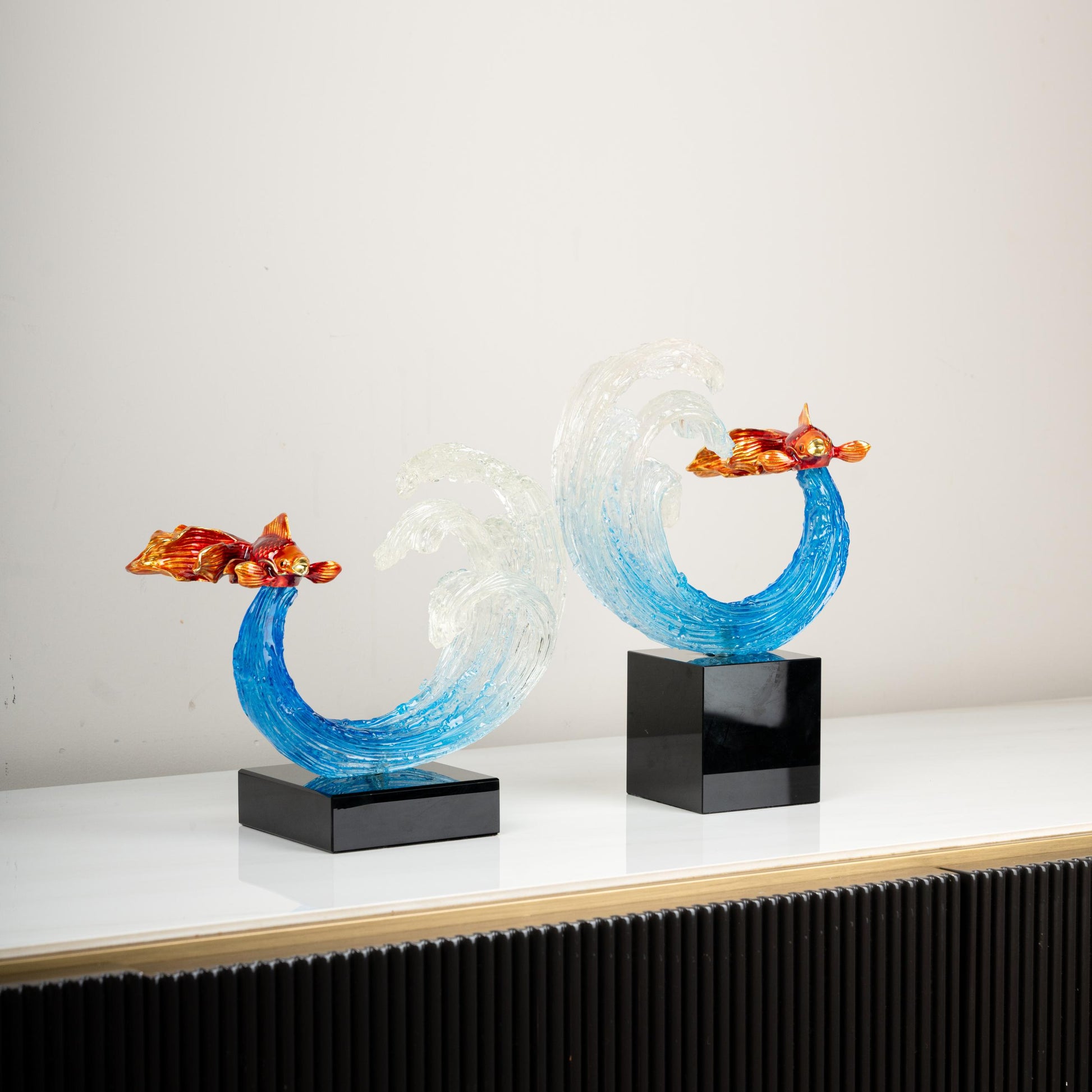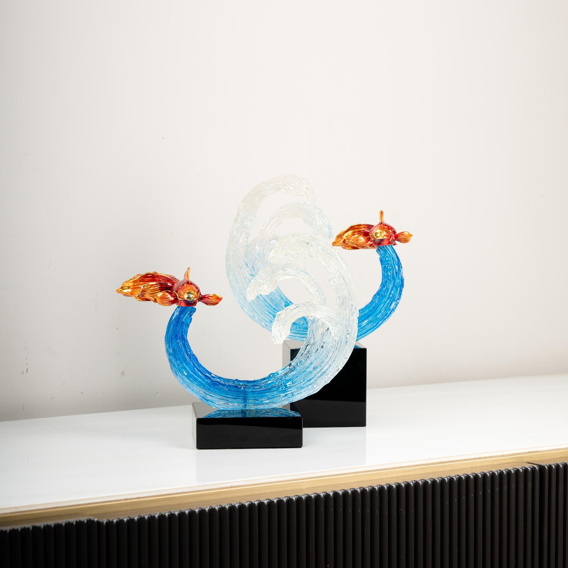 Elevate your home decor with this stunning Glass Ocean Wave Sculpture with Goldfish. This exquisite artwork features a pair of dynamic ocean waves in shades of translucent blue and white, symbolizing the beauty and movement of the sea. Atop each wave, a delicately crafted golden-hued fish leaps forward, capturing the essence of marine elegance. Mounted on sleek black bases, these sculptures make a perfect centerpiece for living rooms, offices, or display shelves. Ideal for ocean lovers and art enthusiasts, this piece adds a touch of sophistication and tranquility to any space.