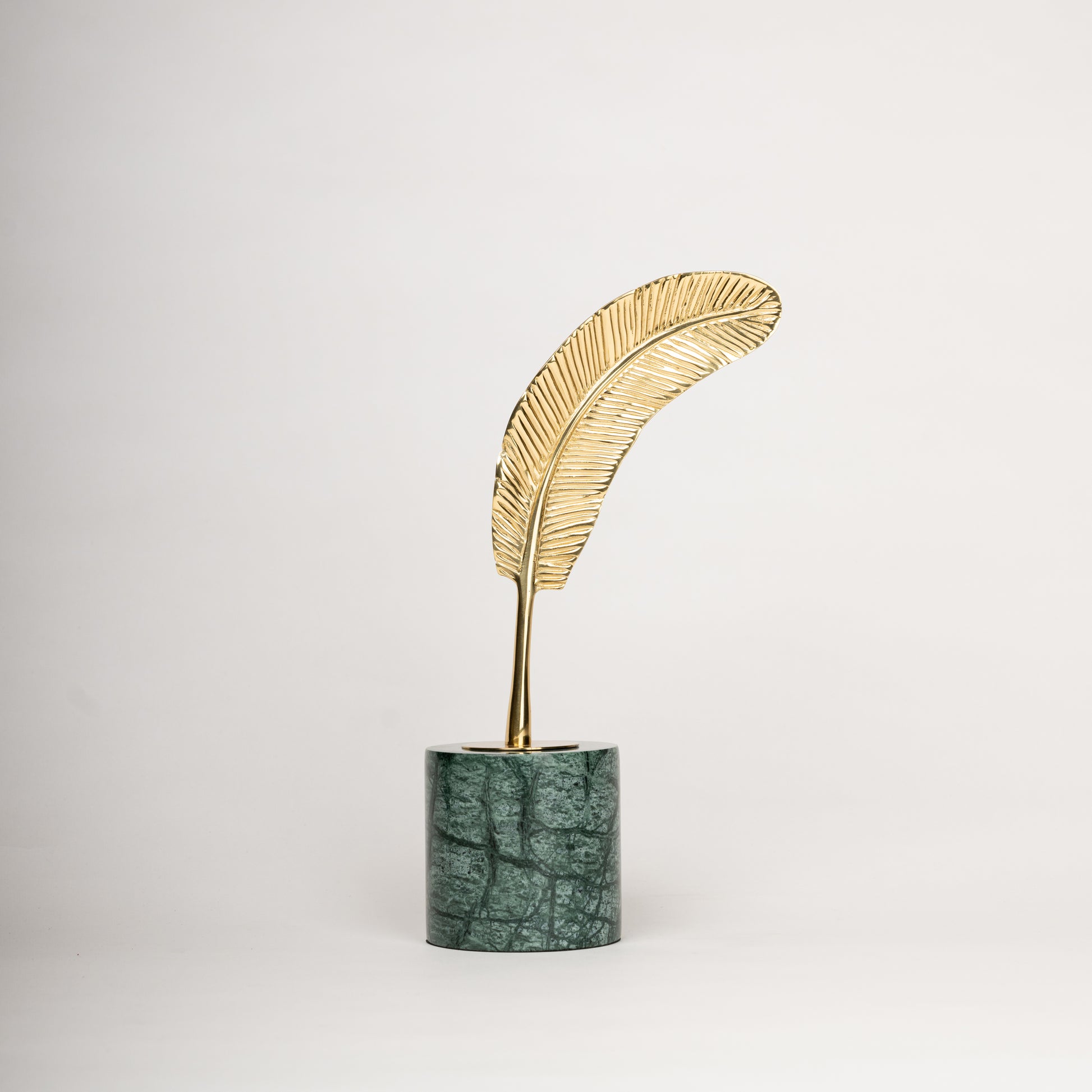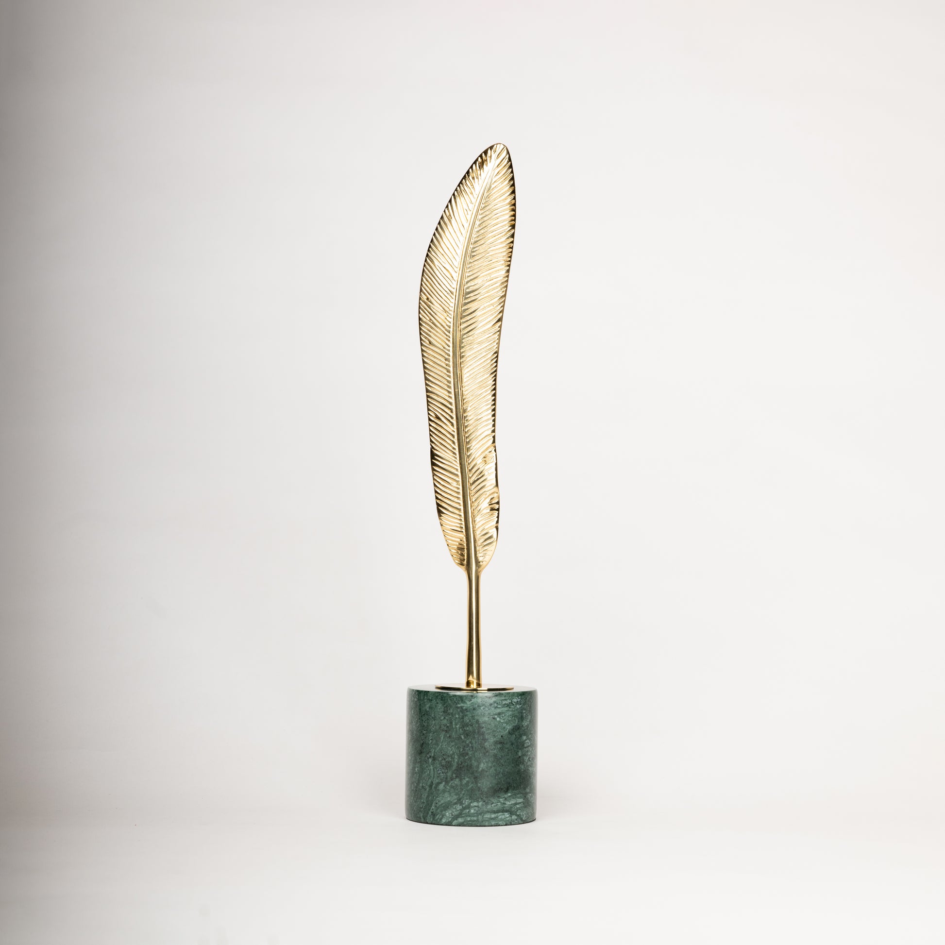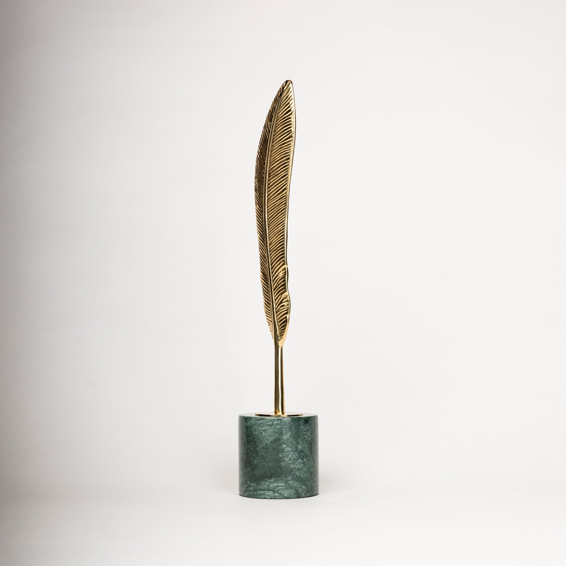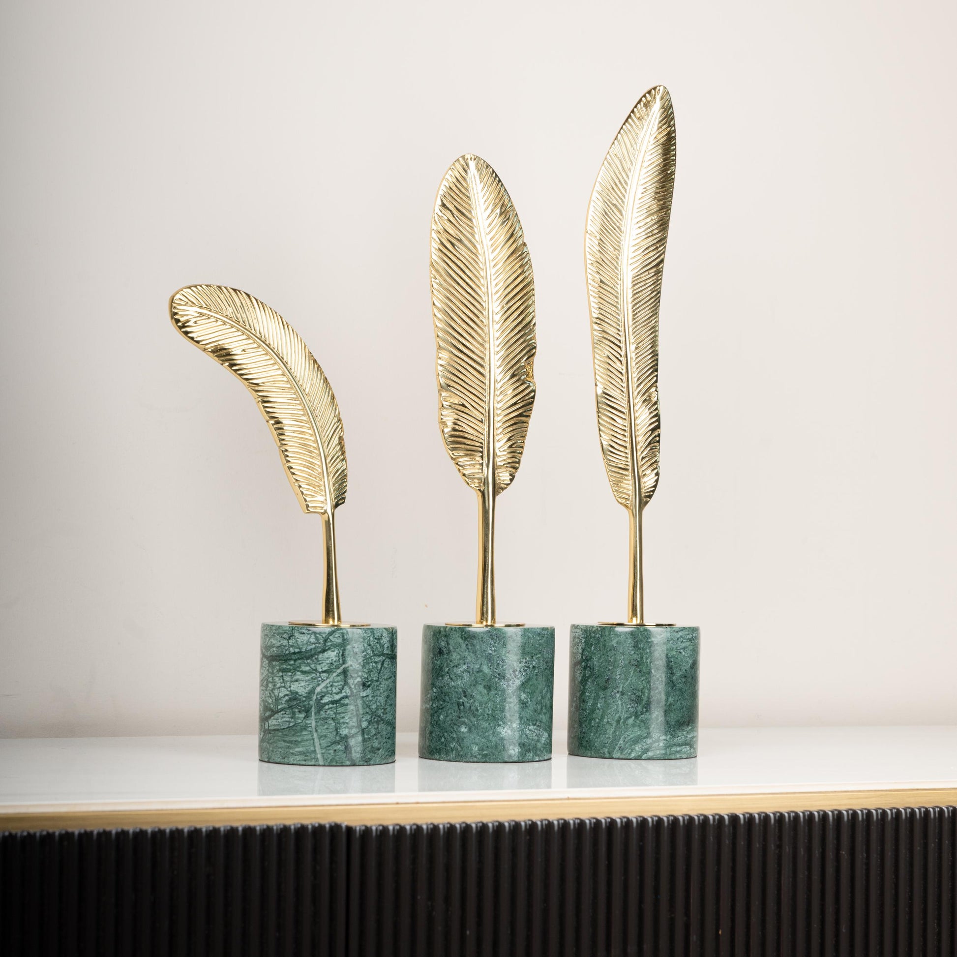 Elevate your décor with this sophisticated trio of gilded feather sculptures, each perched on a luxurious green marble base. The Golden Quill Trio adds a refined yet whimsical accent to any space, whether displayed together as a striking centerpiece or arranged separately to create a cohesive design story throughout your home or office. Crafted with meticulous attention to detail, these sculptures blend timeless elegance with a modern aesthetic.