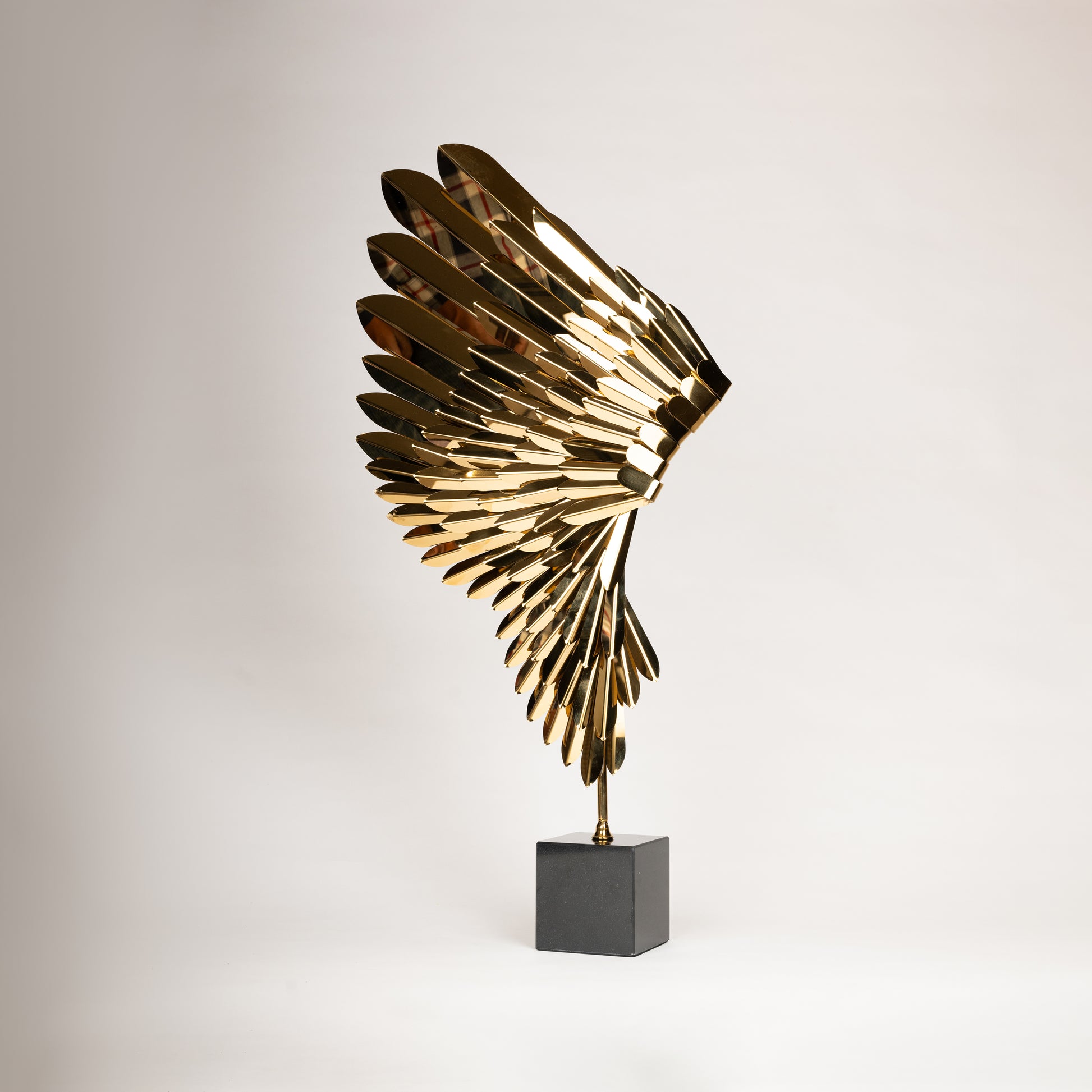 This stunning golden wing sculpture is a symbol of freedom, ambition, and elegance. Featuring a meticulously crafted geometric feather design, the sculpture reflects light beautifully, creating a dynamic visual effect. Mounted on a sleek black marble base, it exudes a modern, luxurious aesthetic, making it an ideal statement piece for homes, offices, or upscale interiors.