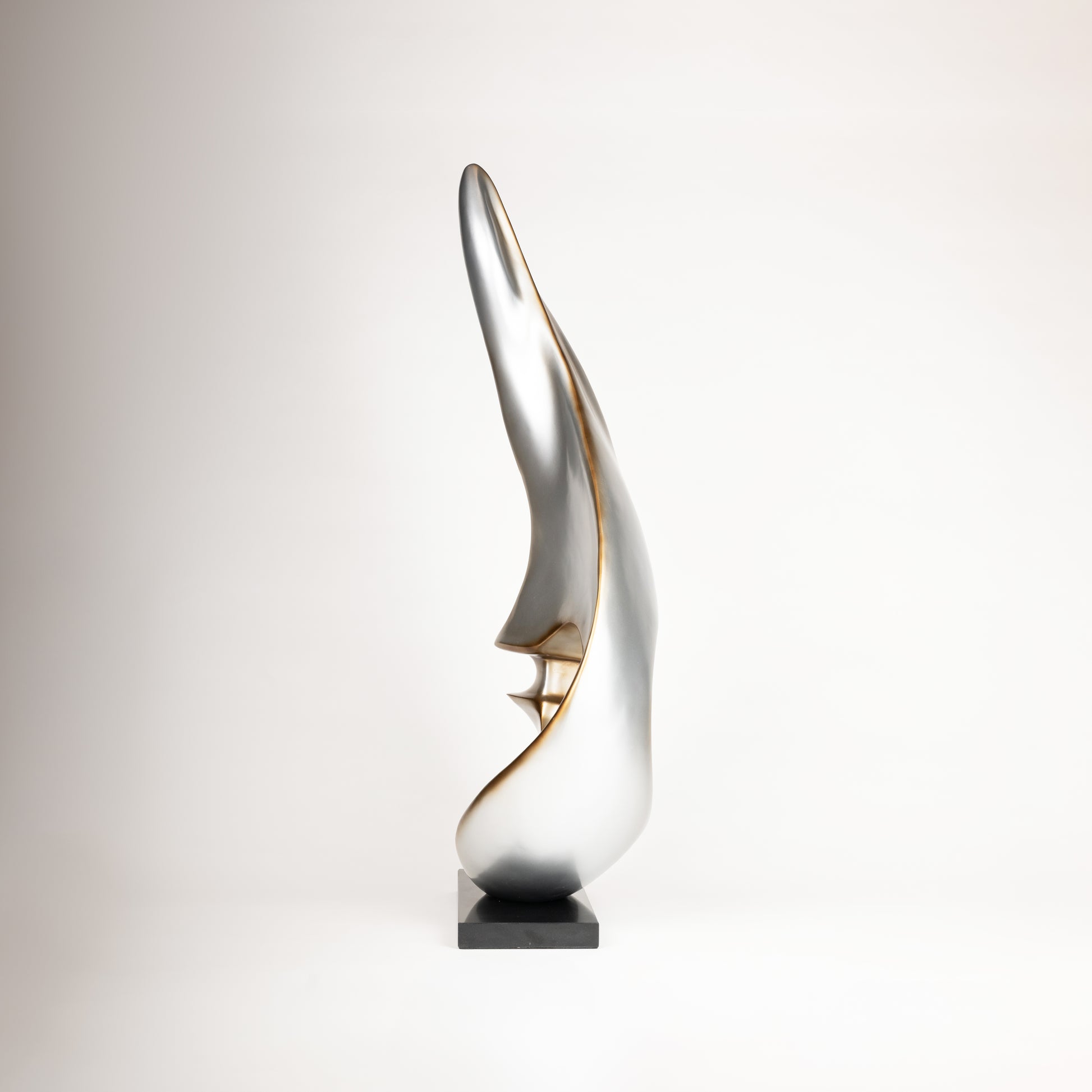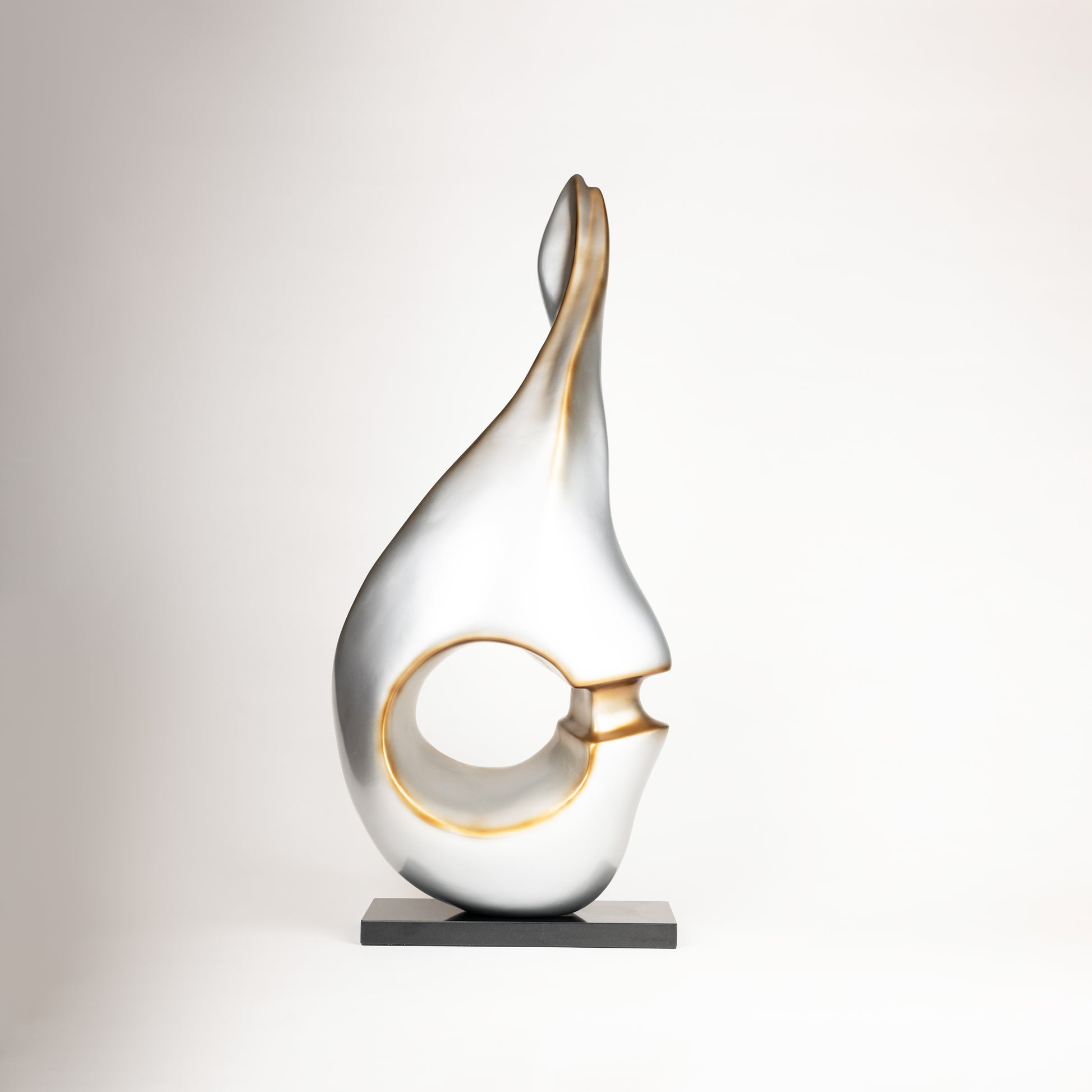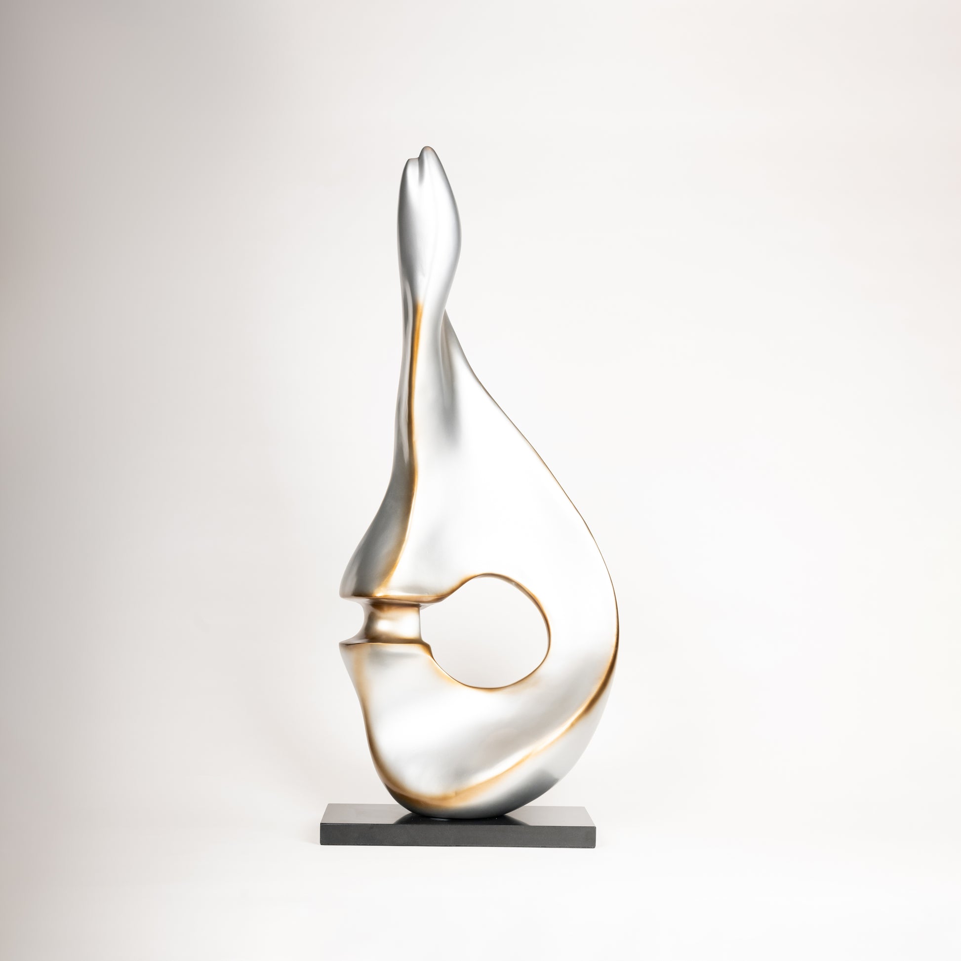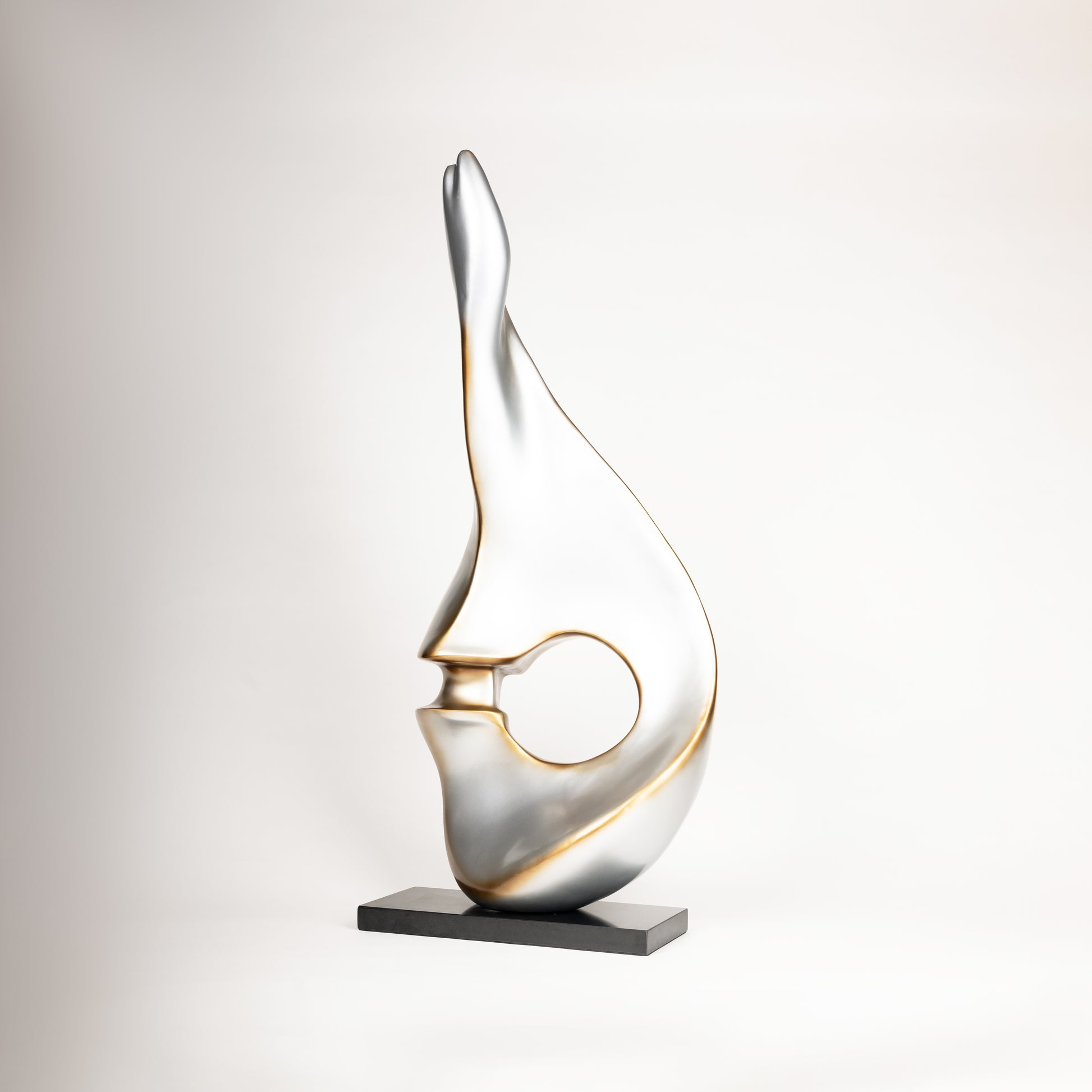 Graceful, modern, and thought-provoking, the Harmony Flow Abstract Sculpture is a true testament to fluid artistry. With its sleek silver finish accented by delicate gold detailing, this piece embodies movement and balance. The organic, curving form with a hollow centre creates a sense of openness and lightness, making it an elegant addition to any contemporary space. Mounted on a sturdy black base, this sculpture is ideal for display on consoles, shelves, or office desks, adding a sophisticated and artistic touch. Whether in a home, gallery, or office, the Harmony Flow Abstract Sculpture effortlessly enhances its surroundings with a blend of modern luxury and timeless appeal.