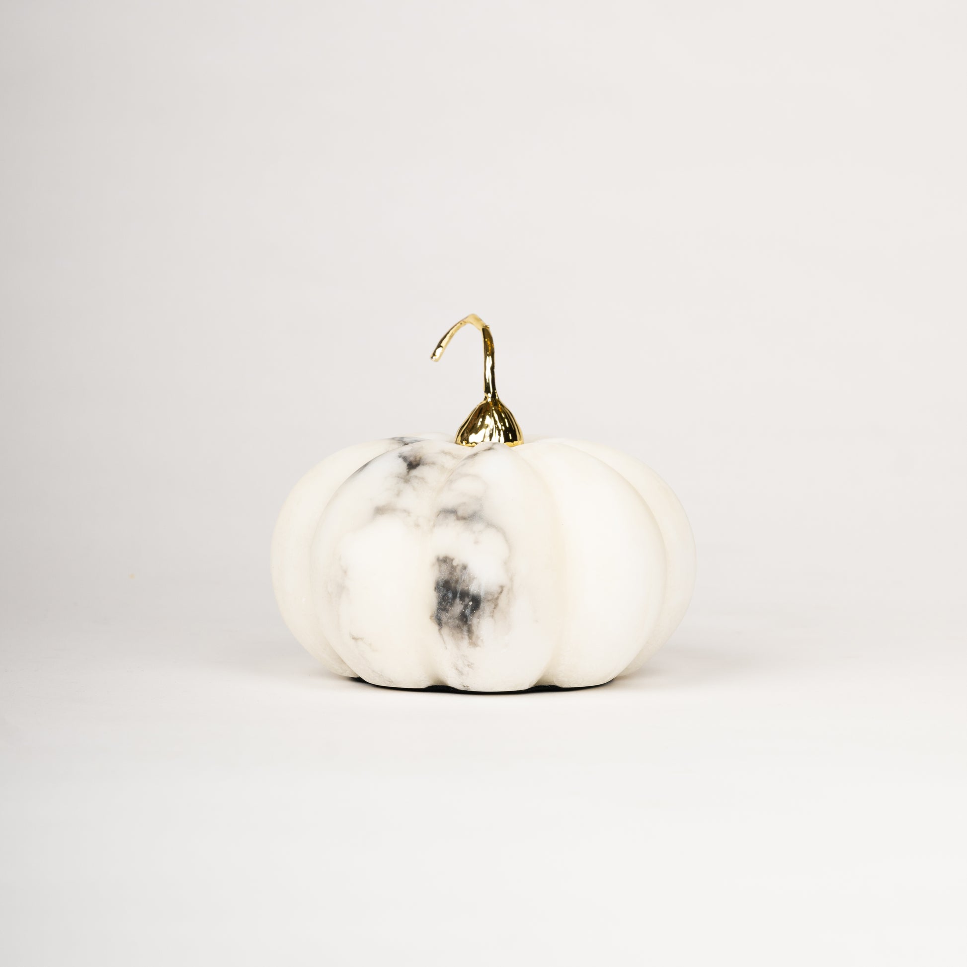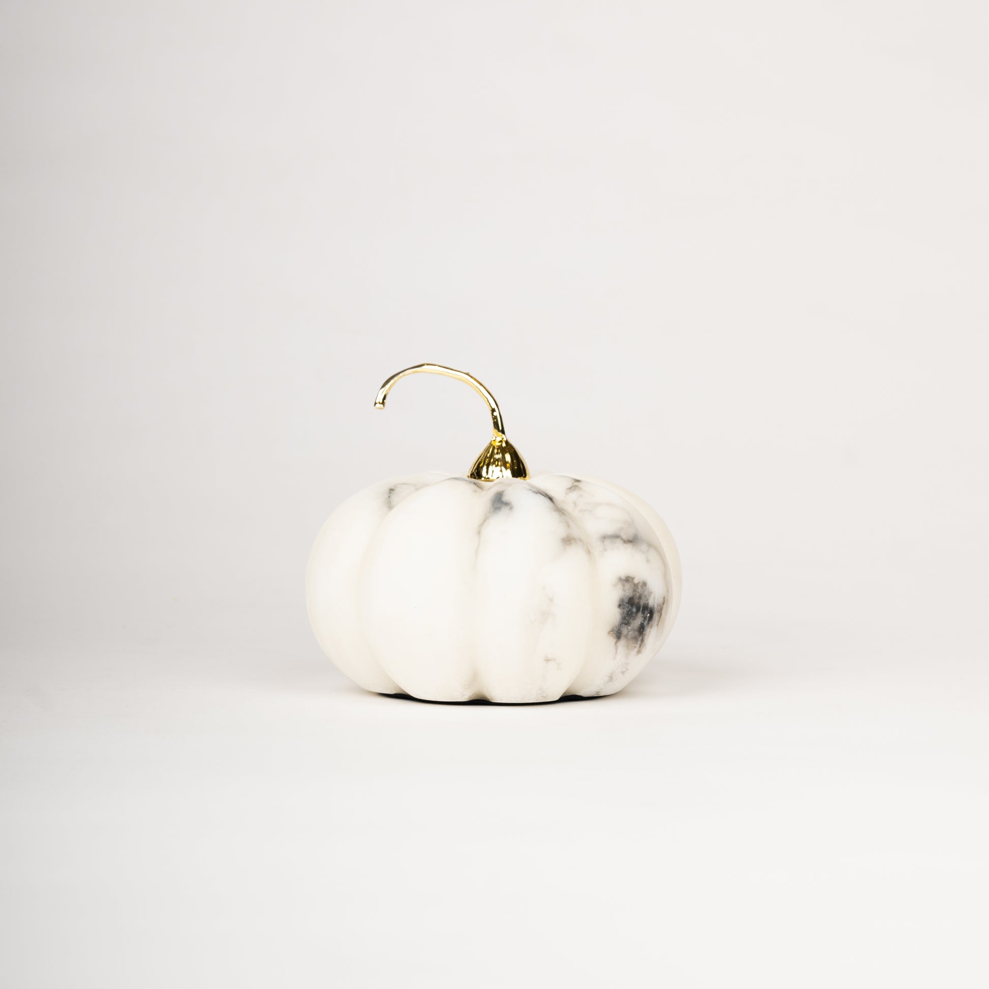 A beautifully crafted white marble pumpkin with golden stems, bringing a luxurious seasonal touch to any space. The natural marble veining adds uniqueness to each piece, making them perfect for fall decor or year-round elegance. Ideal for: Dining tables, mantels, bookshelves, or as a sophisticated autumn accent in modern and classic interiors.