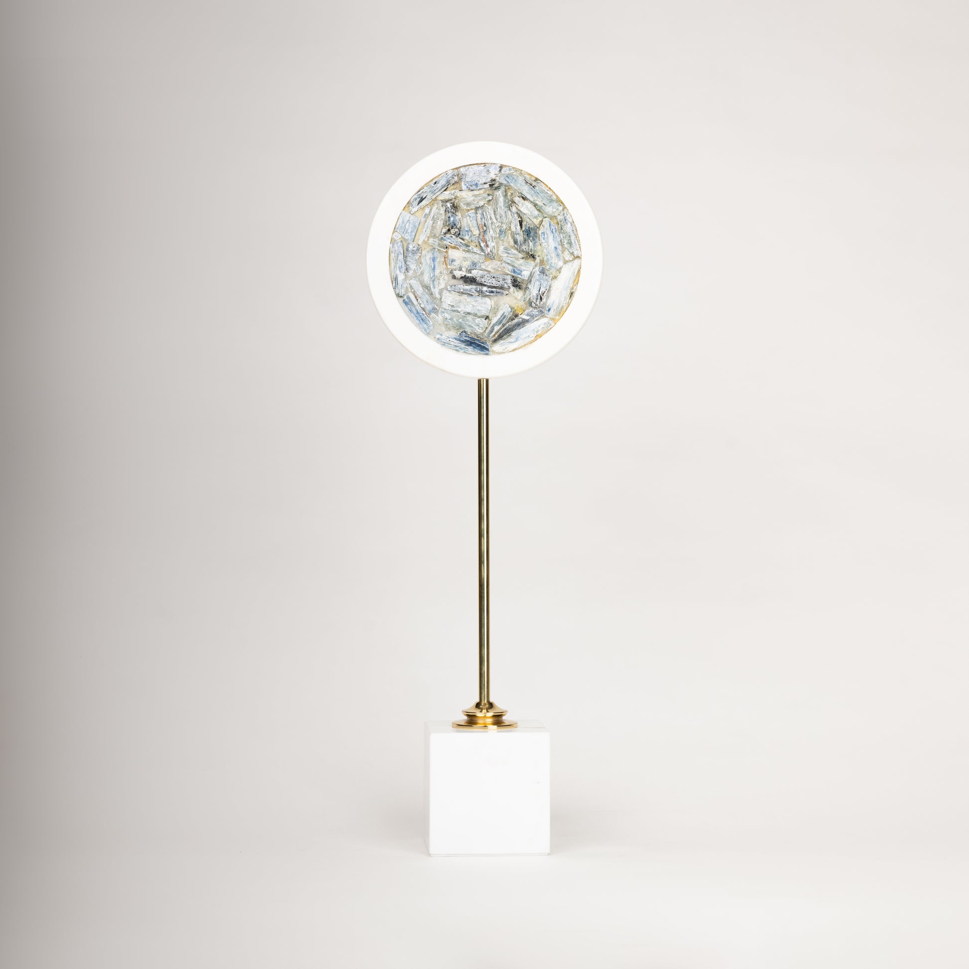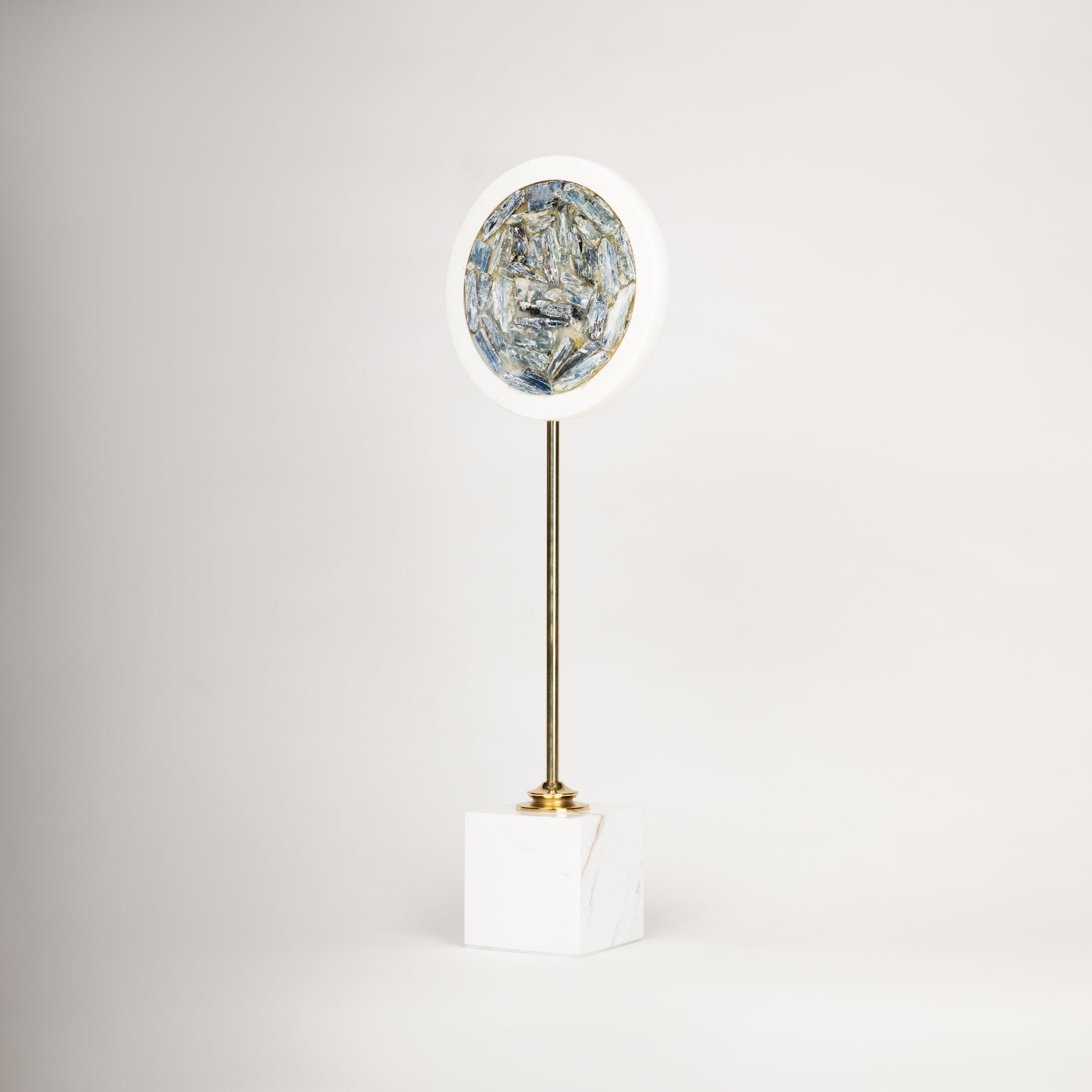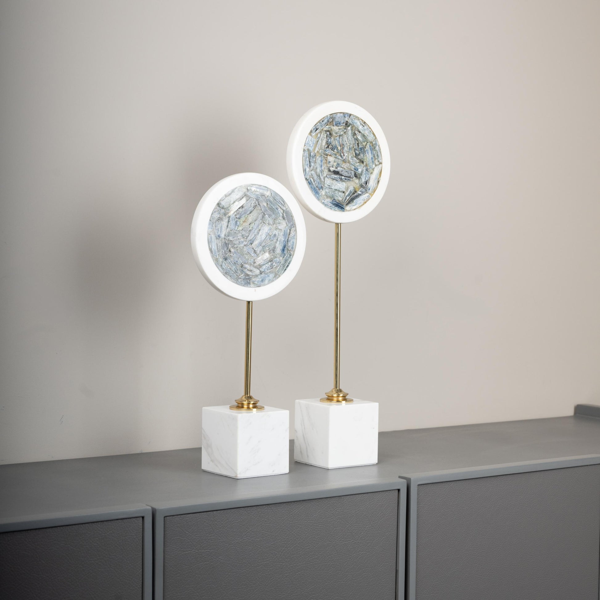 Elevate your home or office décor with these striking modern accent sculptures. Featuring a circular design with a textured blue-gray inlay, these pieces are framed in a sleek white rim and mounted on a gold stem with a marble-finished base. The fusion of luxurious materials and contemporary aesthetics makes them a perfect addition to any space. Whether placed on a console, shelf, or side table, these sculptures bring an elegant and artistic touch to your interior.