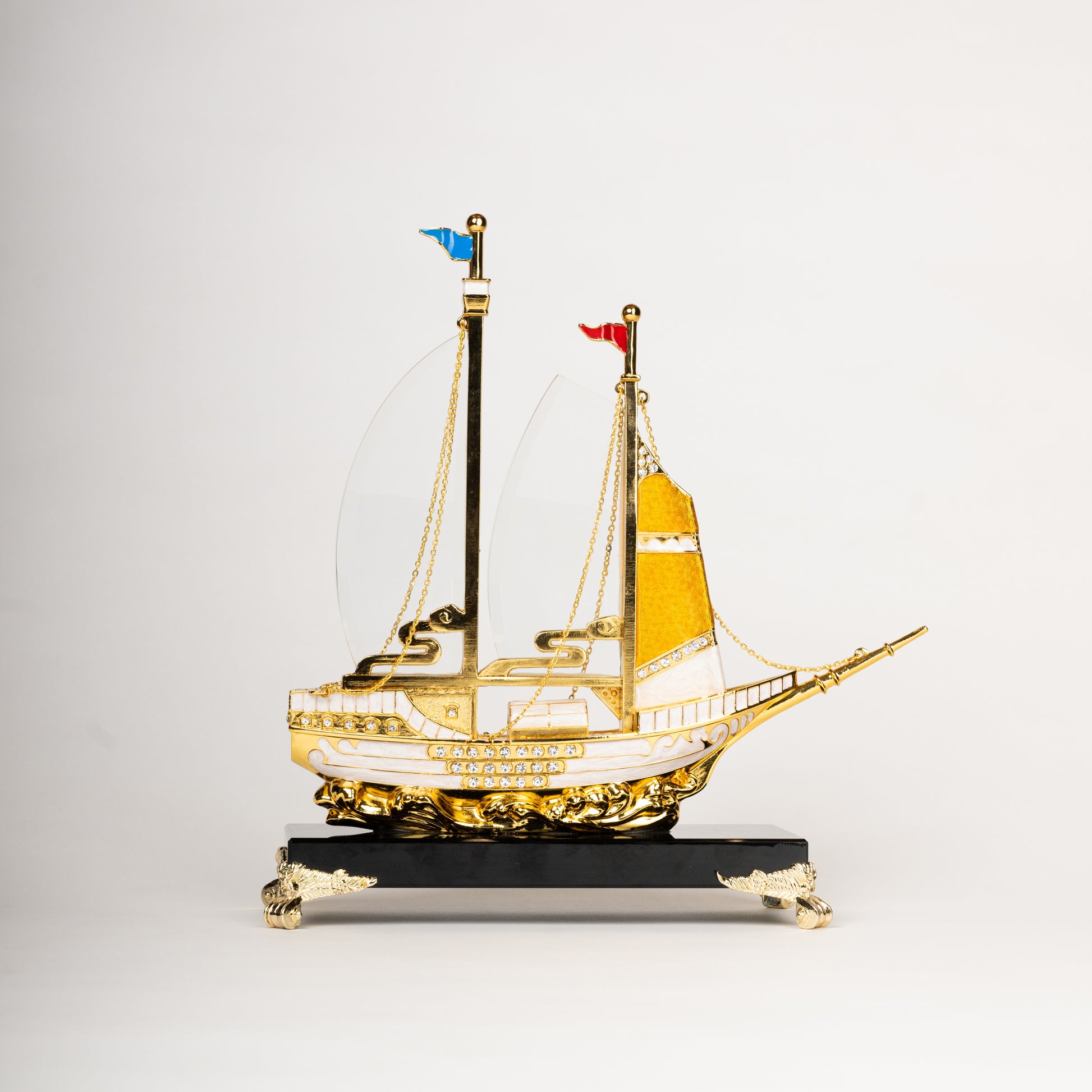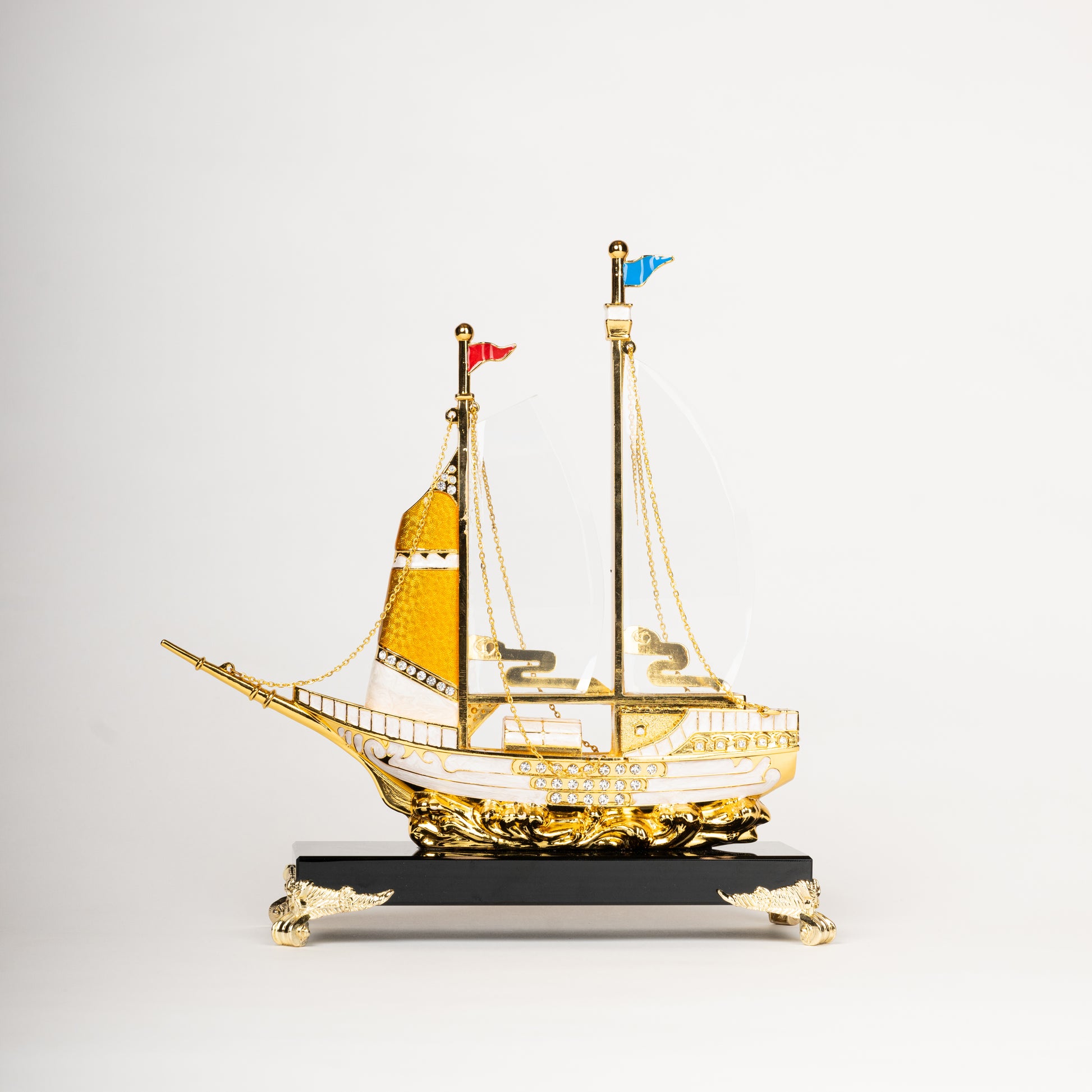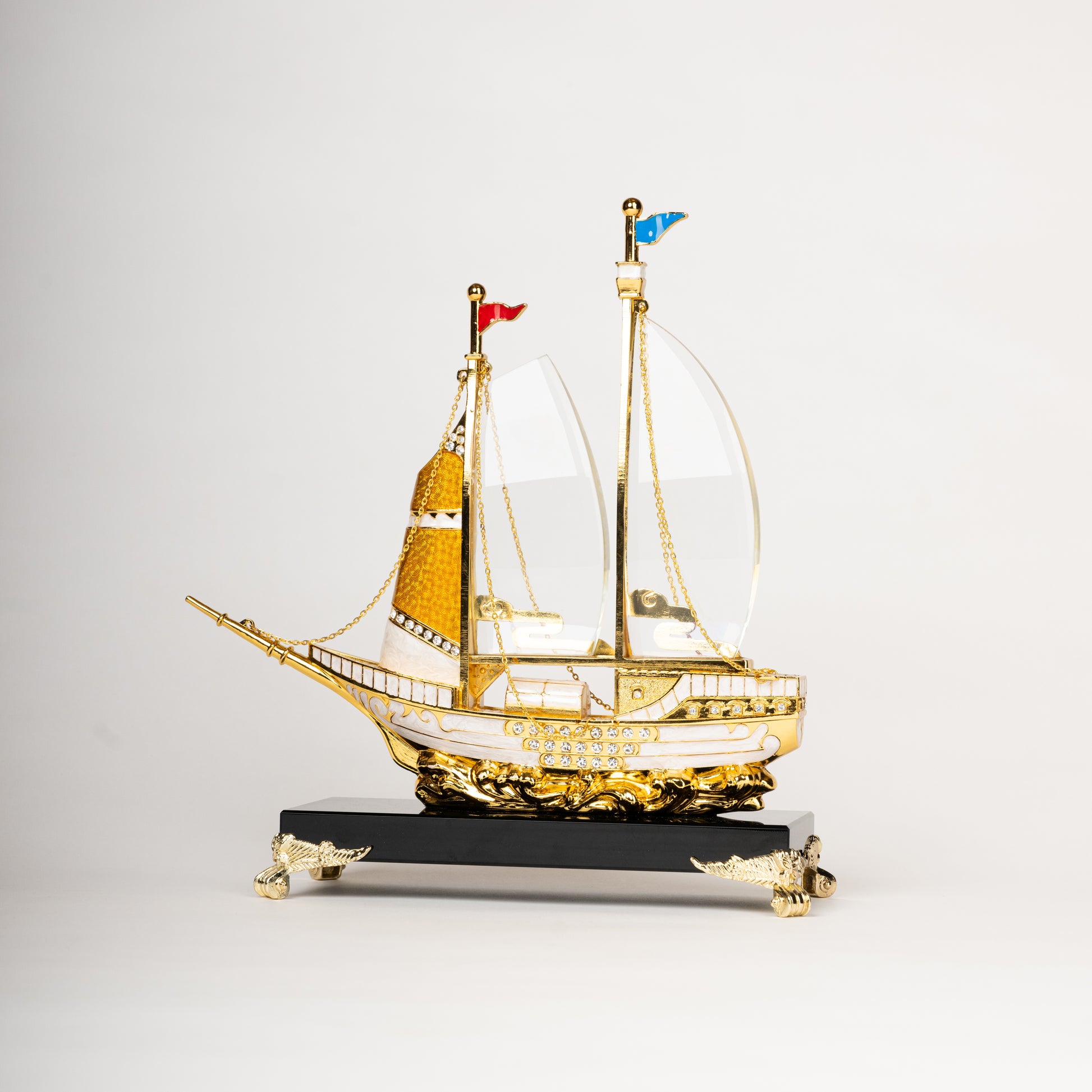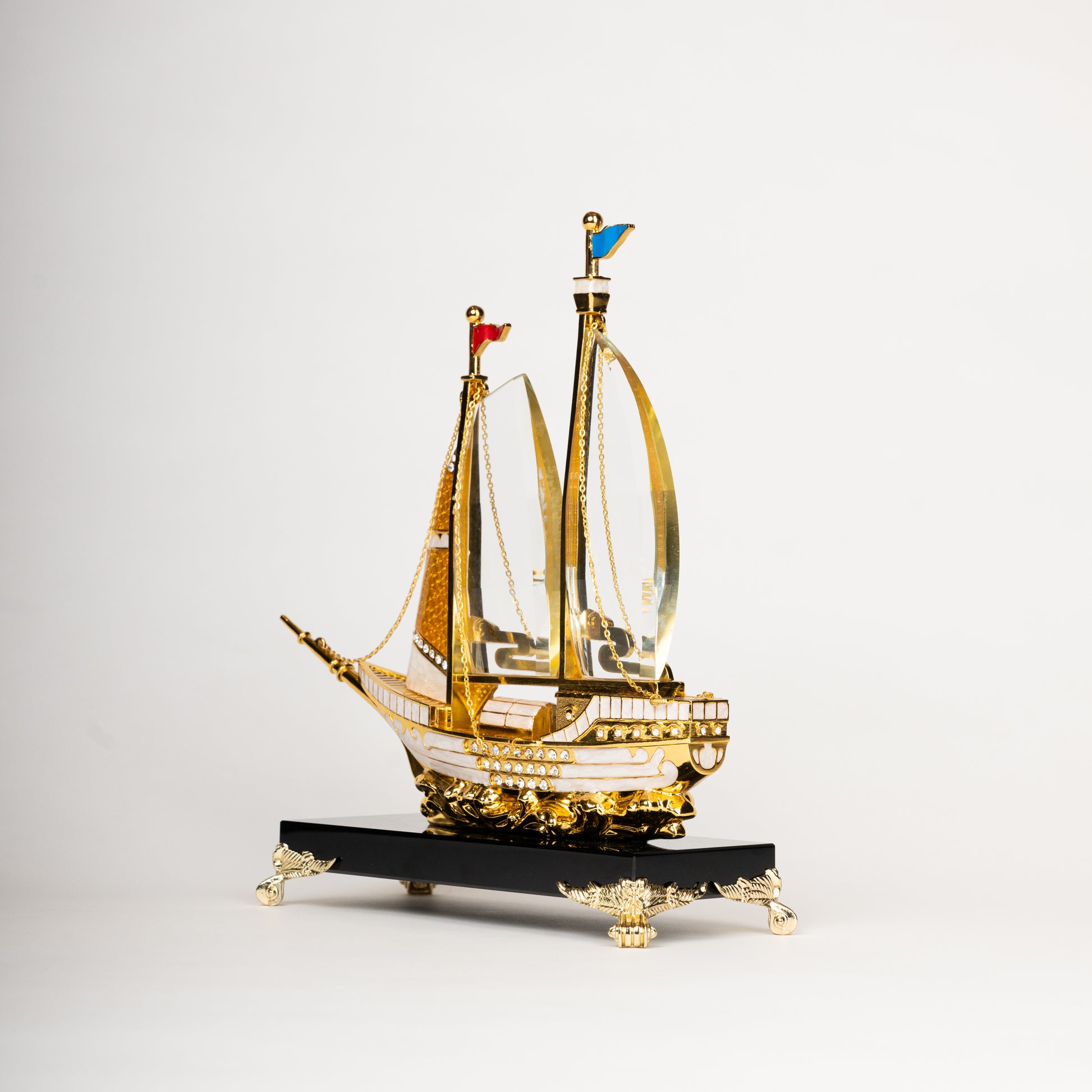 Set sail into elegance with the Royal Crystal Sailboat Showpiece, a stunning decorative piece that embodies luxury and craftsmanship. Designed with a gleaming gold-tone structure, adorned with dazzling embellishments, and featuring exquisitely crafted crystal sails, this masterpiece exudes sophistication and charm. The sleek black base enhances its regal appeal, making it a perfect centrepiece for home or office decor. A symbol of adventure, prosperity, and success, this exquisite sailboat is an ideal gift for special occasions or a stylish addition to your personal collection. Let this artistic creation bring a touch of opulence and inspiration to your space.