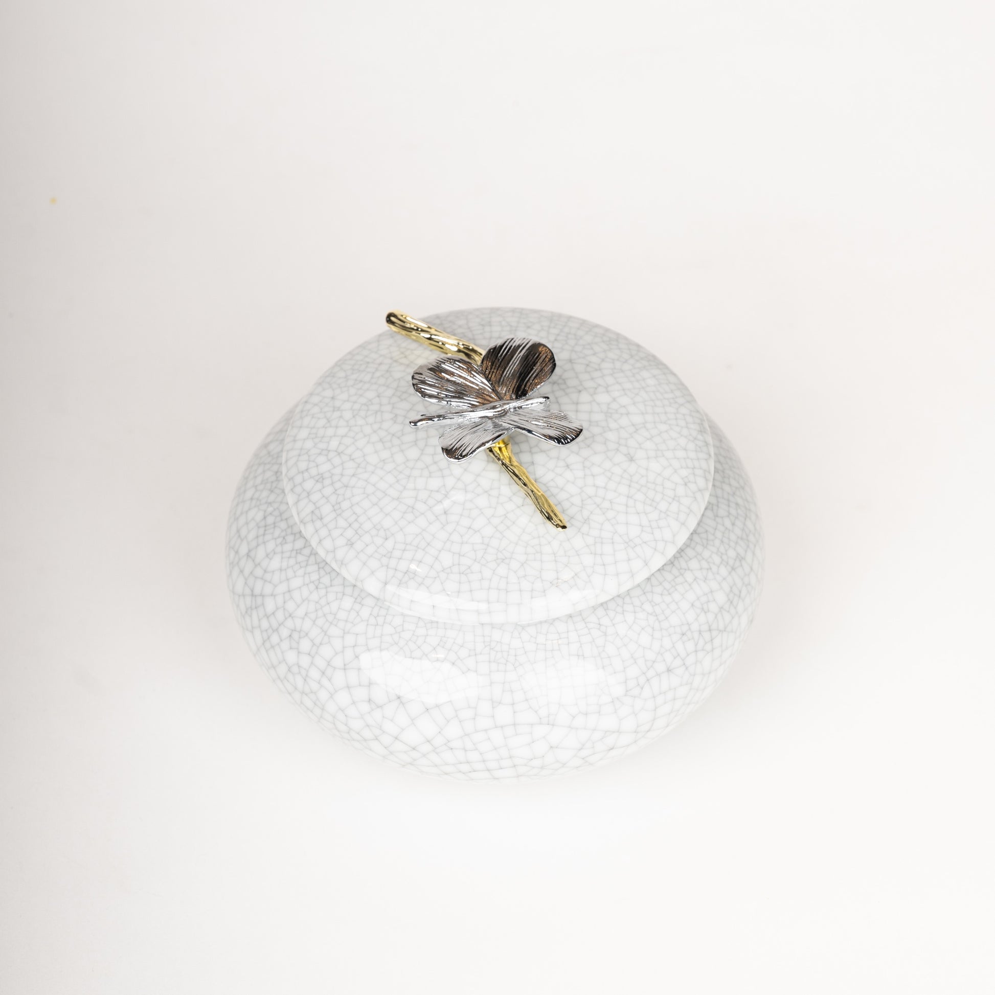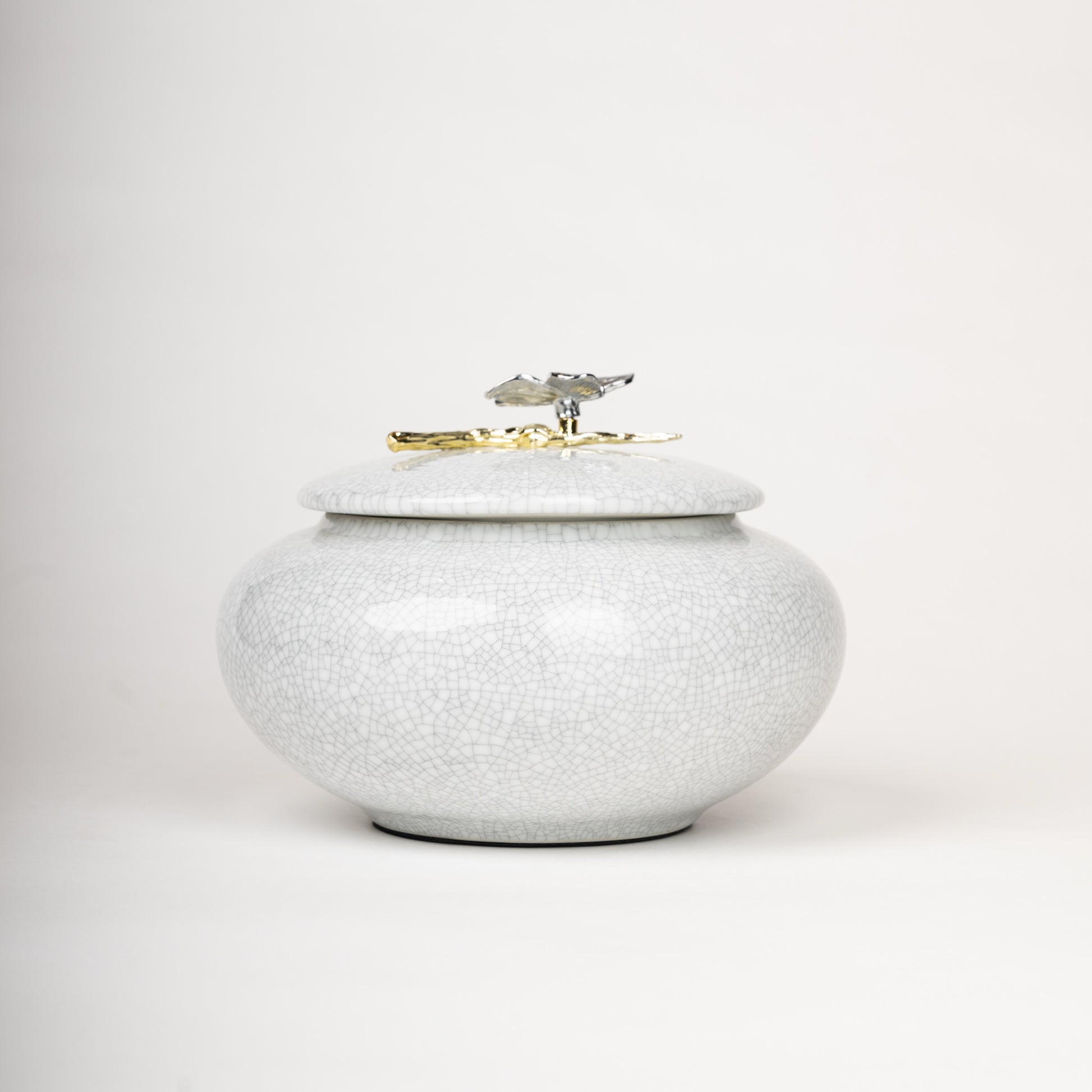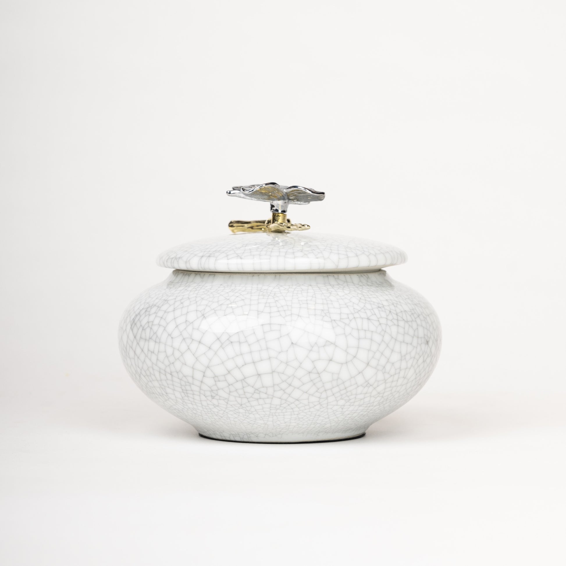 This elegant ceramic jar set features a crackle-textured glaze in soft white, complemented by intricately designed metal dragonfly lids with gold-accented branches. The blend of organic texture and metallic details creates a sophisticated yet natural aesthetic. Ideal for: Storage and decoration in living rooms, bedrooms, or kitchens. These jars work well as centerpieces, vanity organizers, or keepsake containers.