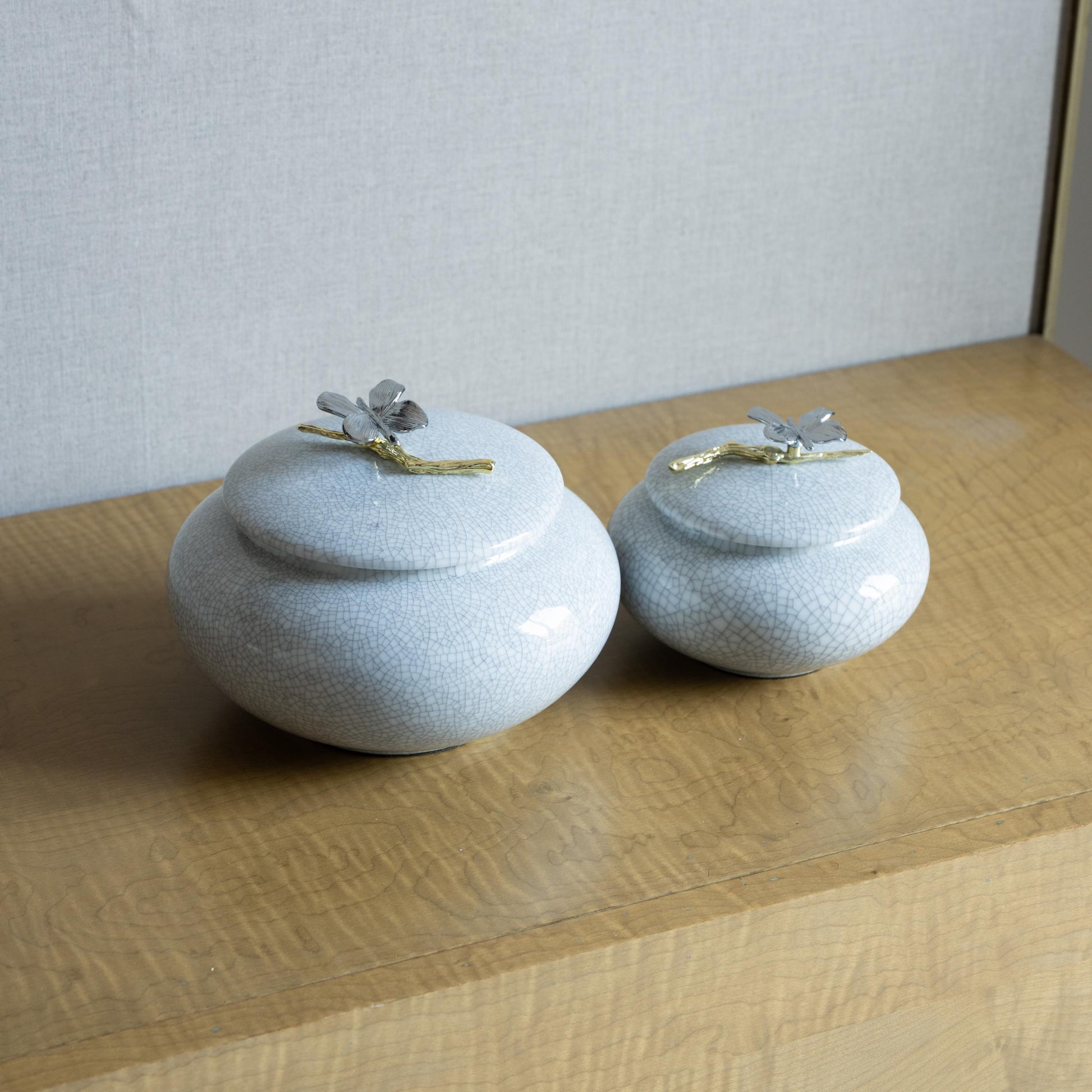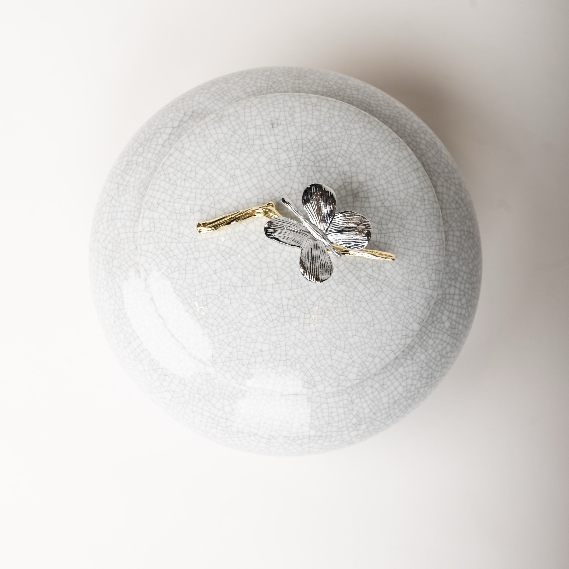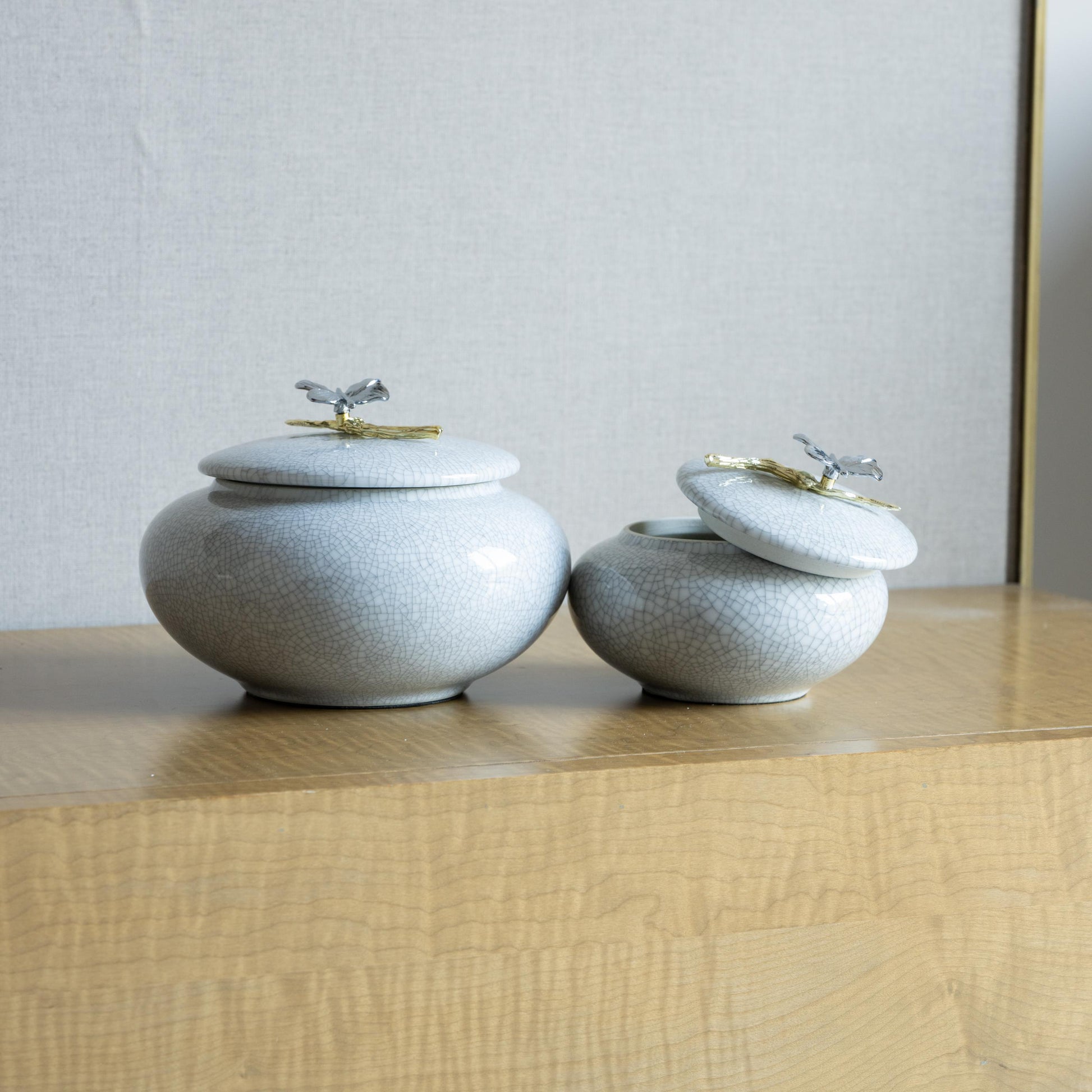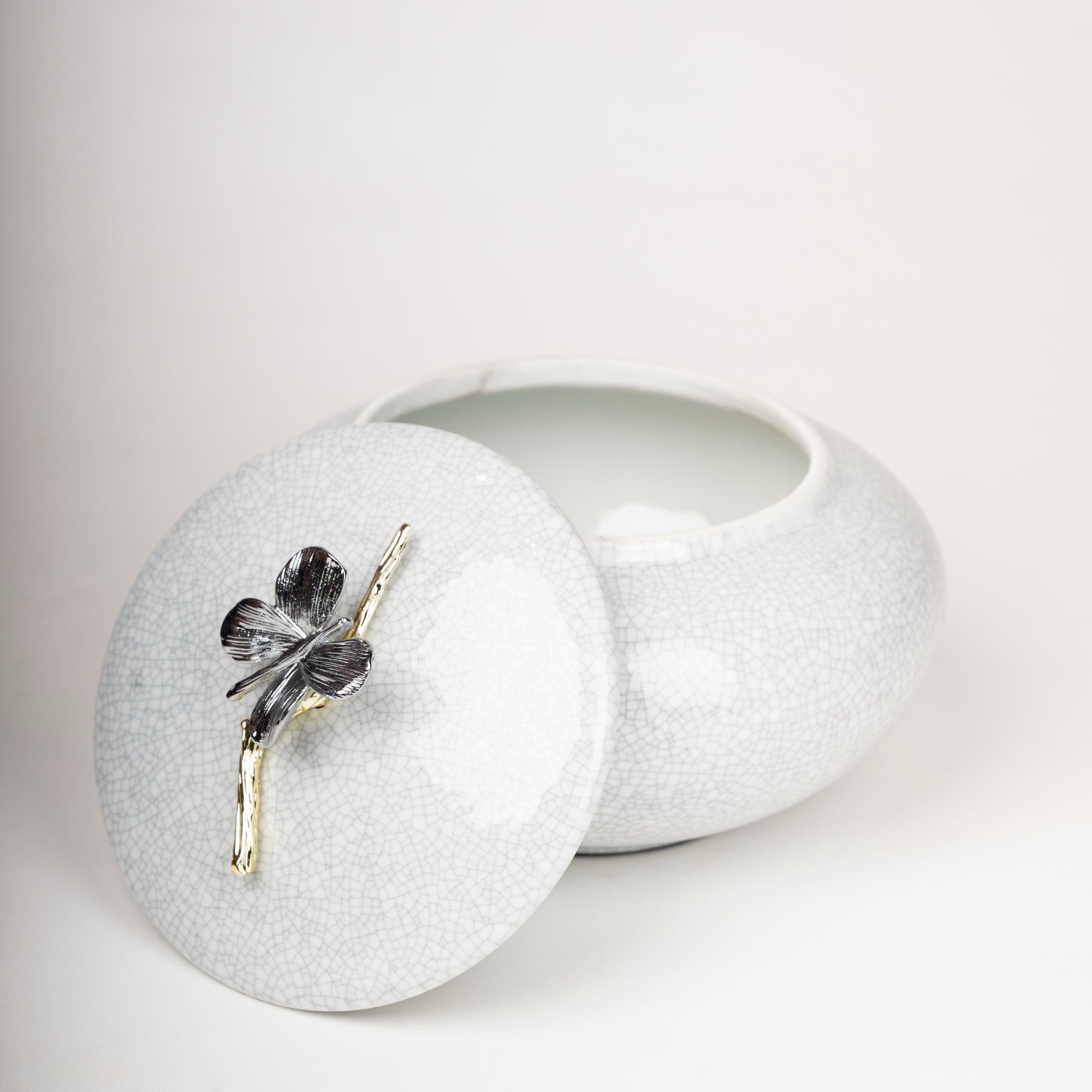 This elegant ceramic jar set features a crackle-textured glaze in soft white, complemented by intricately designed metal dragonfly lids with gold-accented branches. The blend of organic texture and metallic details creates a sophisticated yet natural aesthetic. Ideal for: Storage and decoration in living rooms, bedrooms, or kitchens. These jars work well as centerpieces, vanity organizers, or keepsake containers.